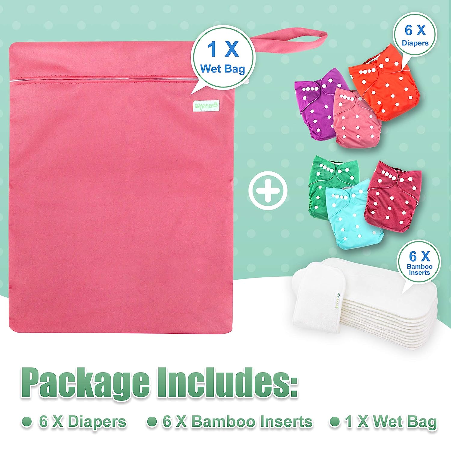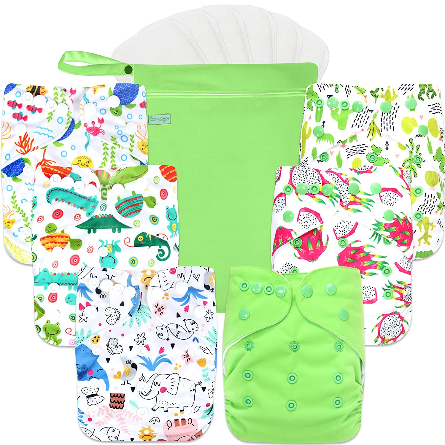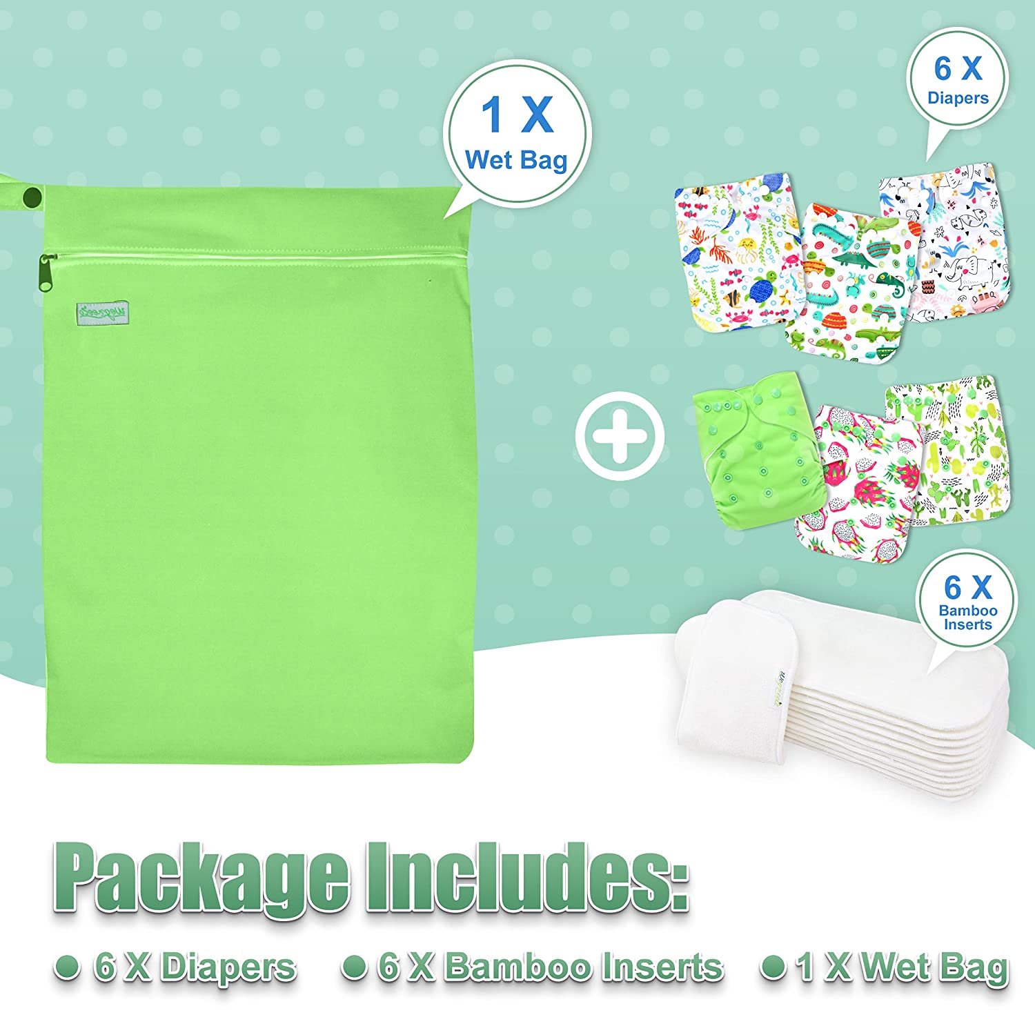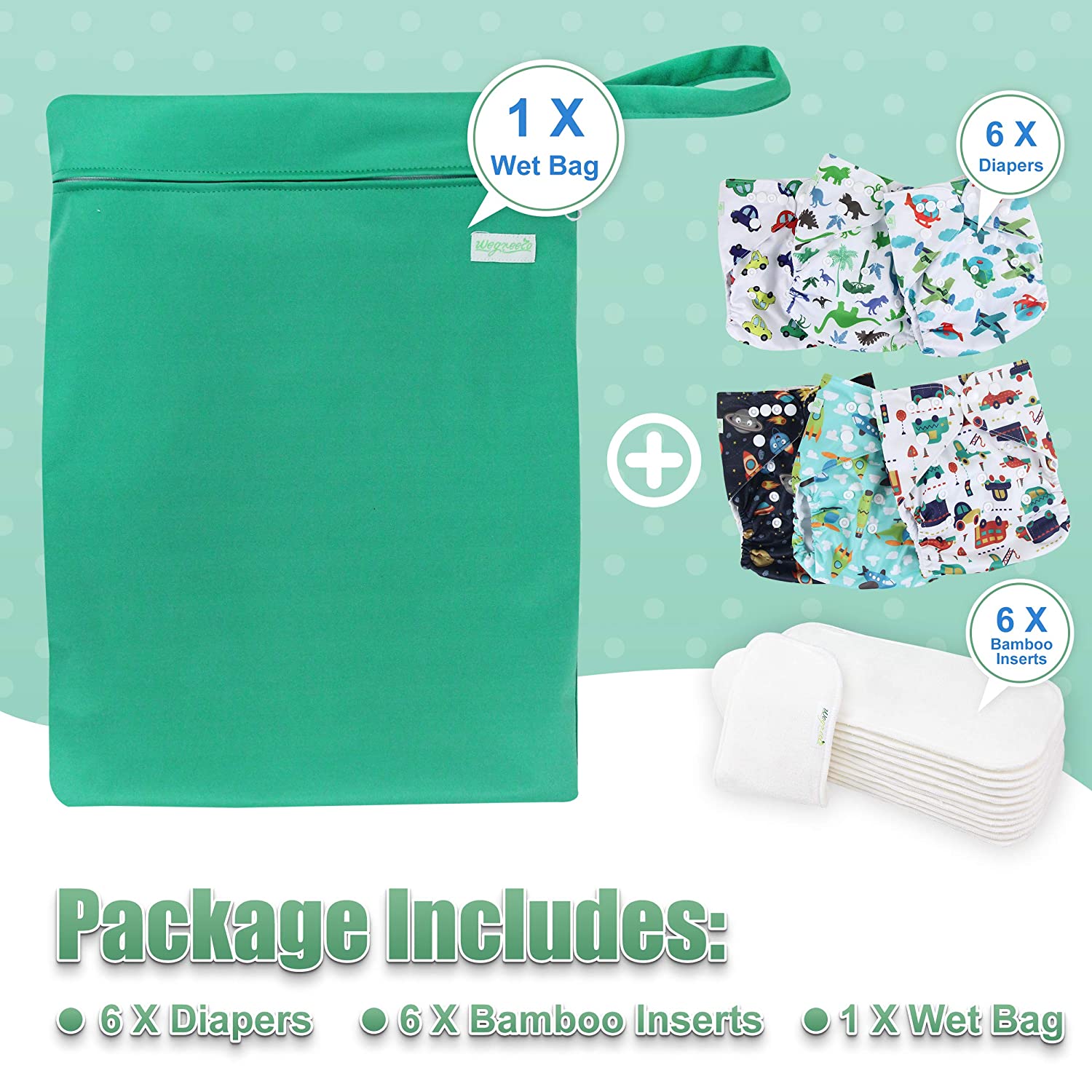 Wegreeco Washable Reusable Baby Cloth Pocket Diapers 6 Pack + 6 Bamboo Inserts (with 1 Wet Bag, Bright Animals) one Size