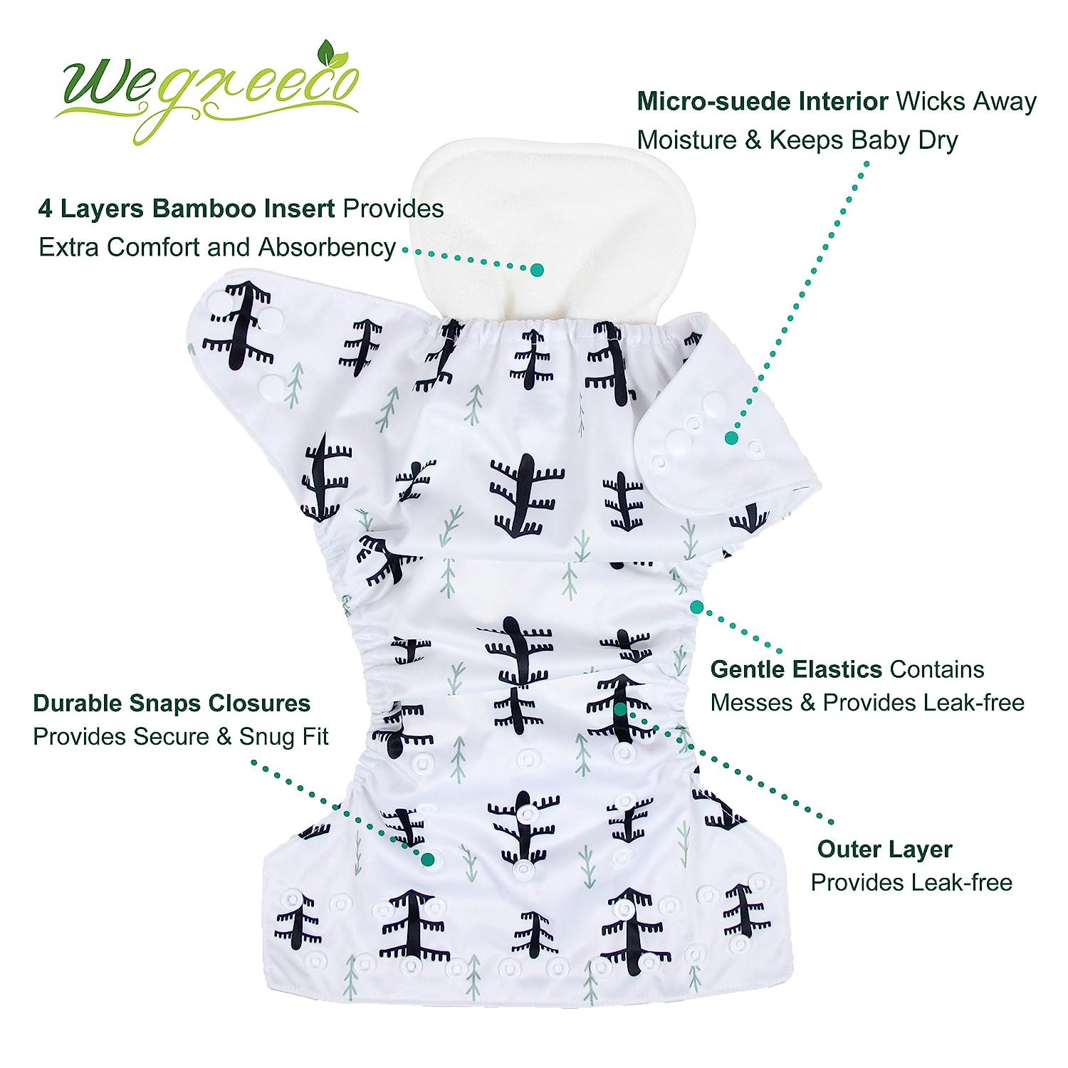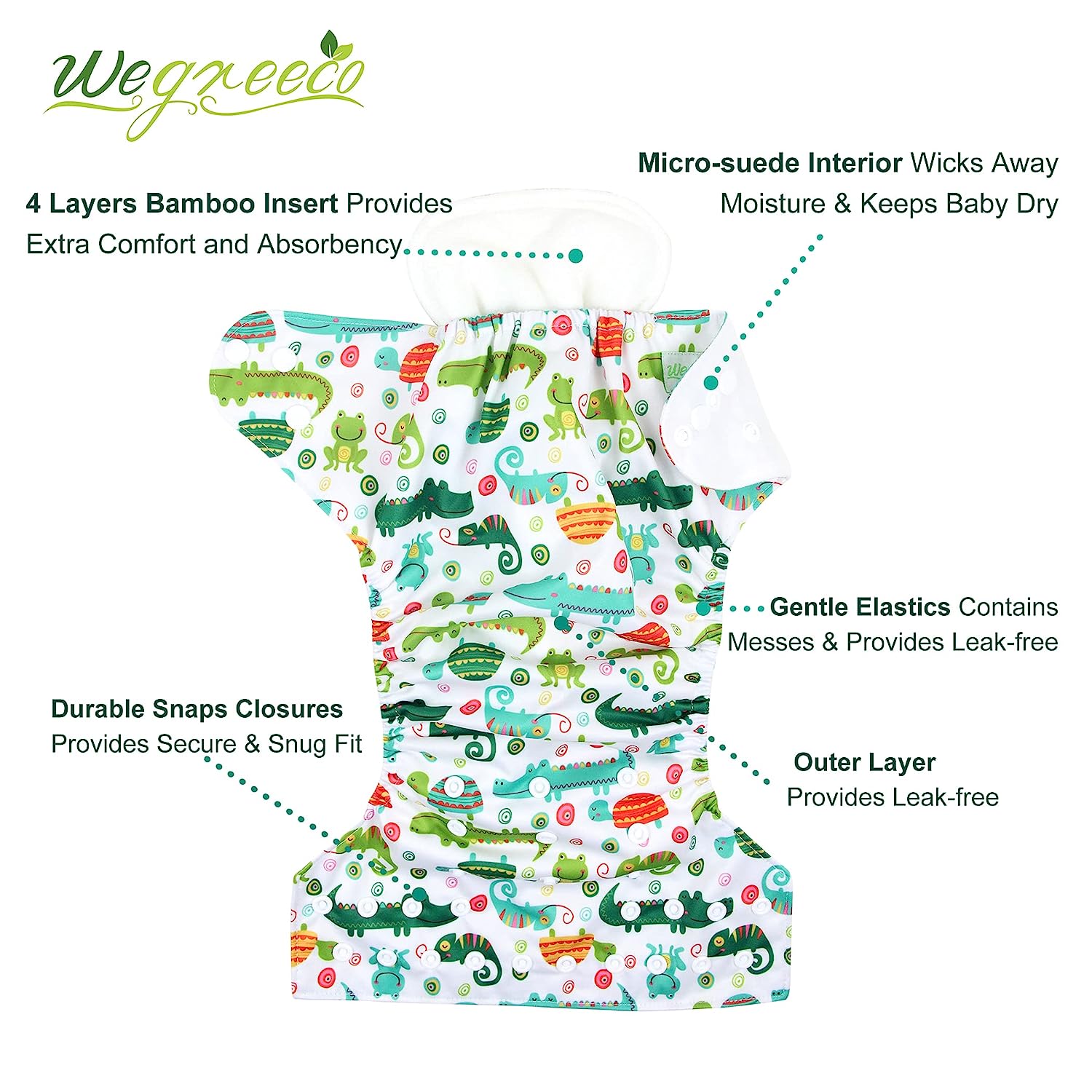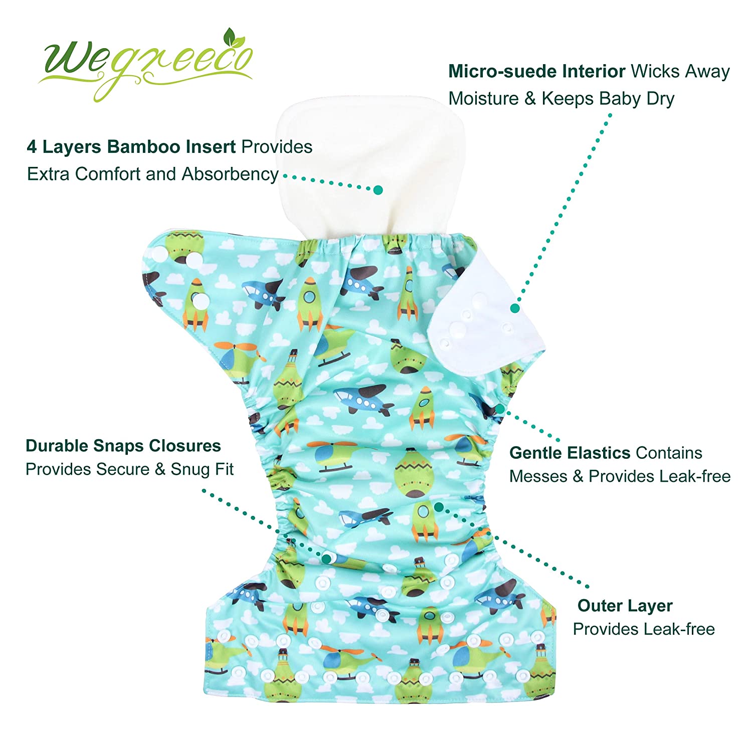 • One Size Adjustable Diaper: Three rows of adjustable snaps to allow for a small, medium,large size in one diaper. Usually fit 0-2 years' baby. If you are looking for a pocket diaper to last through your baby’s infancy, toddlerhood and even future babies. Wegreeco baby diapers grow with your baby.