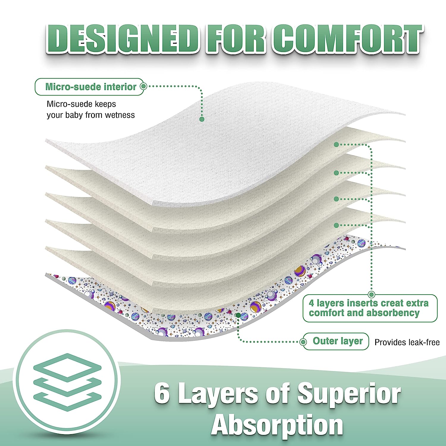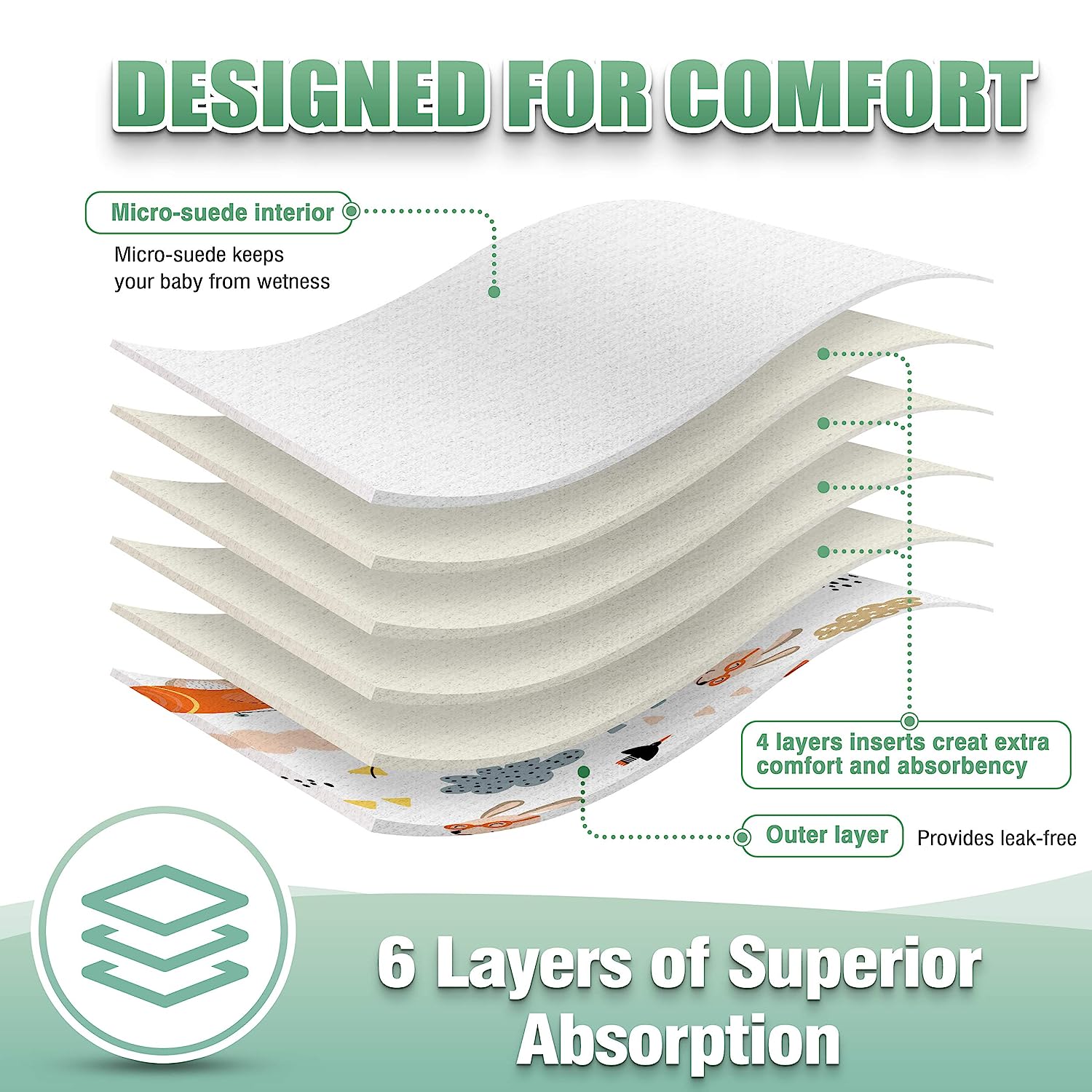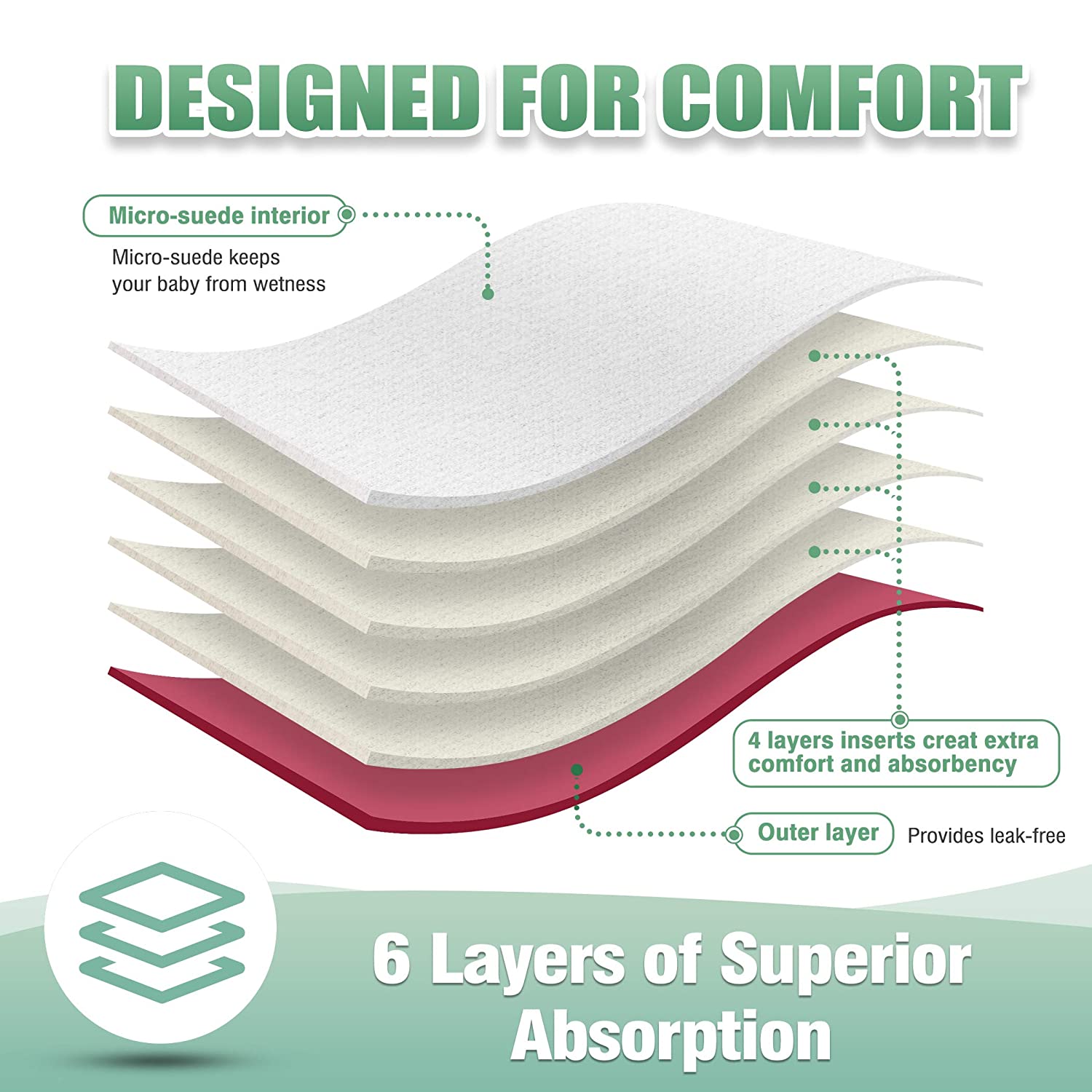 • Absorbent and Soft Insert: Inserts are made of 2 layers of microfiber and 2 layers bamboo, the strong absorbent material with breathability and softness is gentle on your baby’s bottom, keep your baby comfortable and happy. The inner suede cloth touches baby, and wicks moisture away from baby's bottom to the insert.