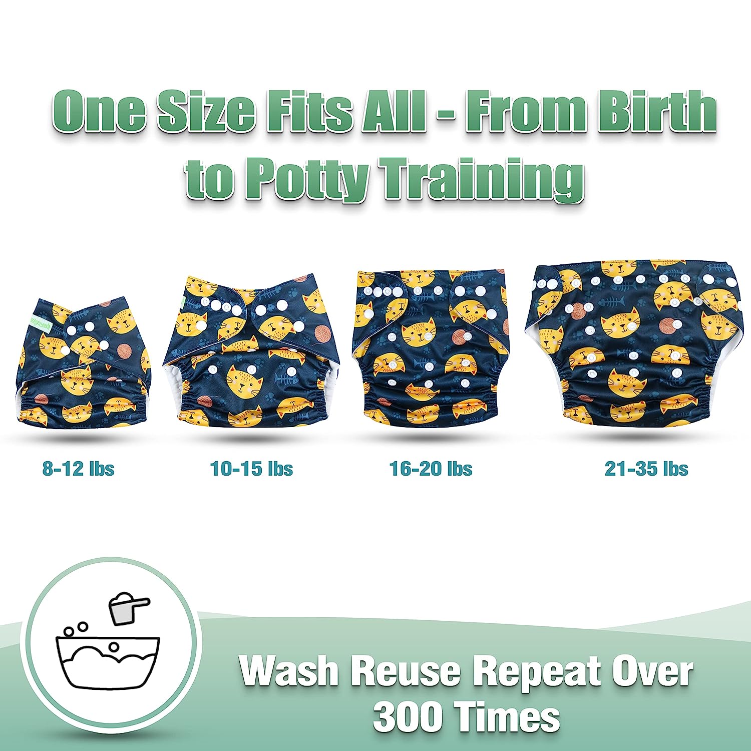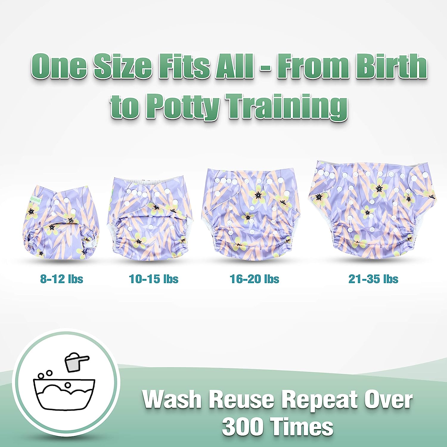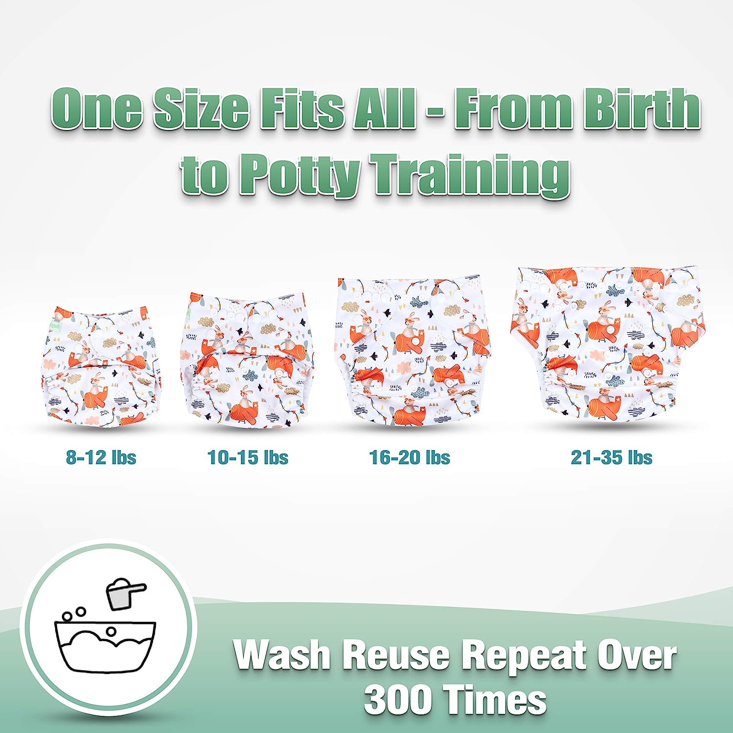 • Reusable & Washable: As disposable nappies are not great for our planet, these reusable, super-absorbent cloth diapers are an ideal choice, they will last you for a much longer period of time. No need to stock and store multiple size diapers. A great idea for your baby and our planet.