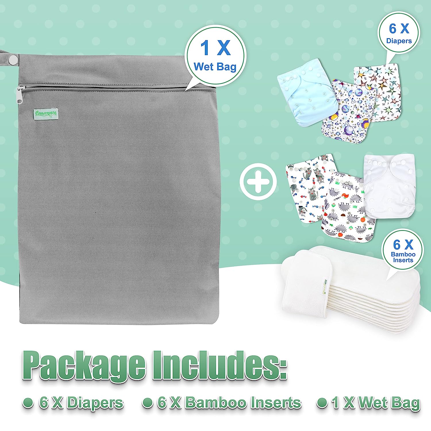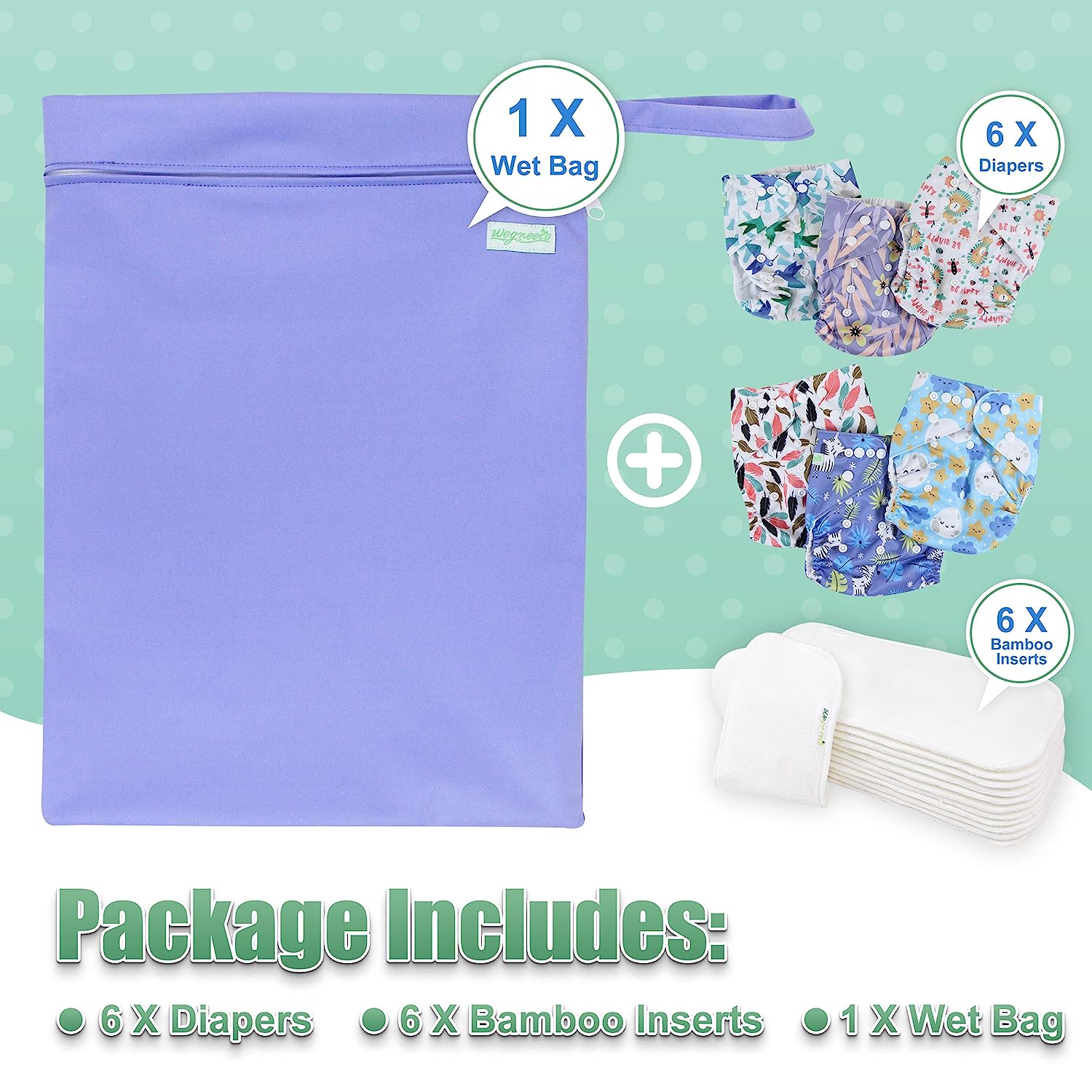 Wegreeco Washable Reusable Baby Cloth Pocket Diapers 6 Pack + 6 Bamboo Inserts (with 1 Wet Bag, Forest, Animals) one Size