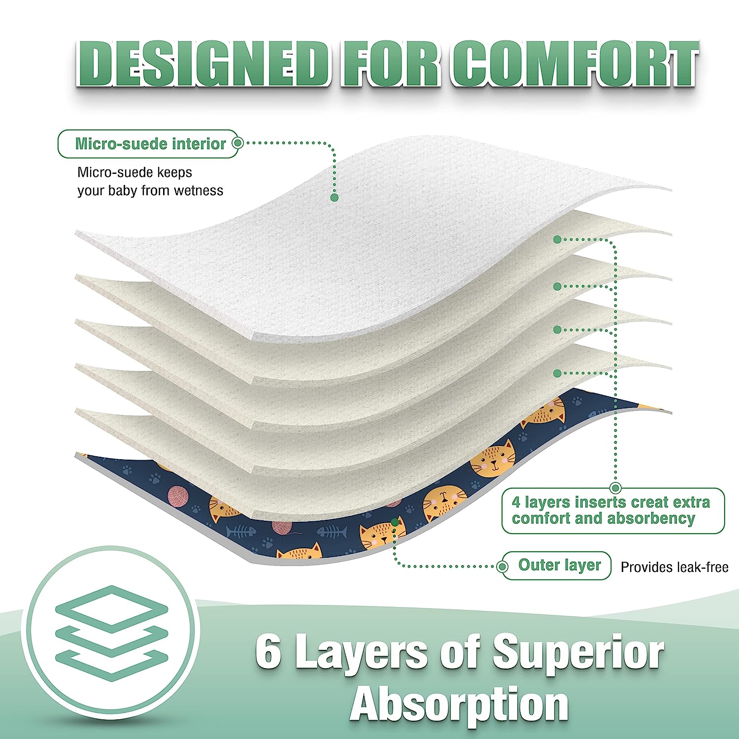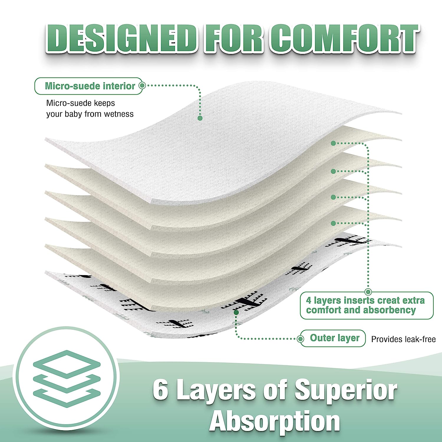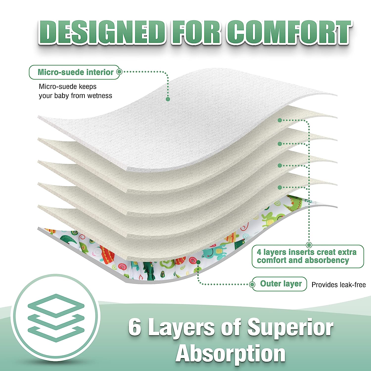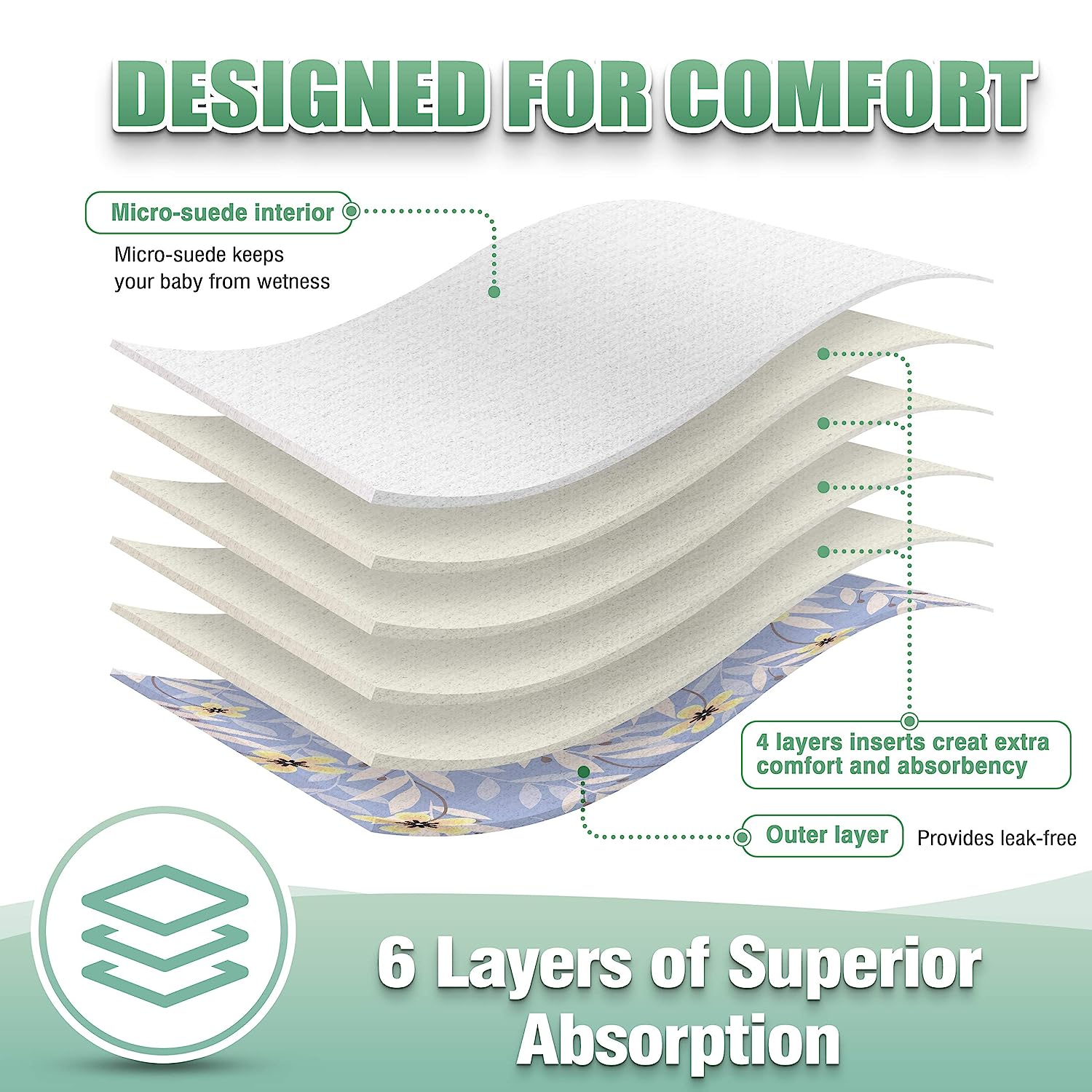 • Absorbent and Soft Insert: Inserts are made of 2 layers of microfiber and 2 layers bamboo, the strong absorbent material with breathability and softness is gentle on your baby’s bottom, keep your baby comfortable and happy. The inner suede cloth touches baby, and wicks moisture away from baby's bottom to the insert.