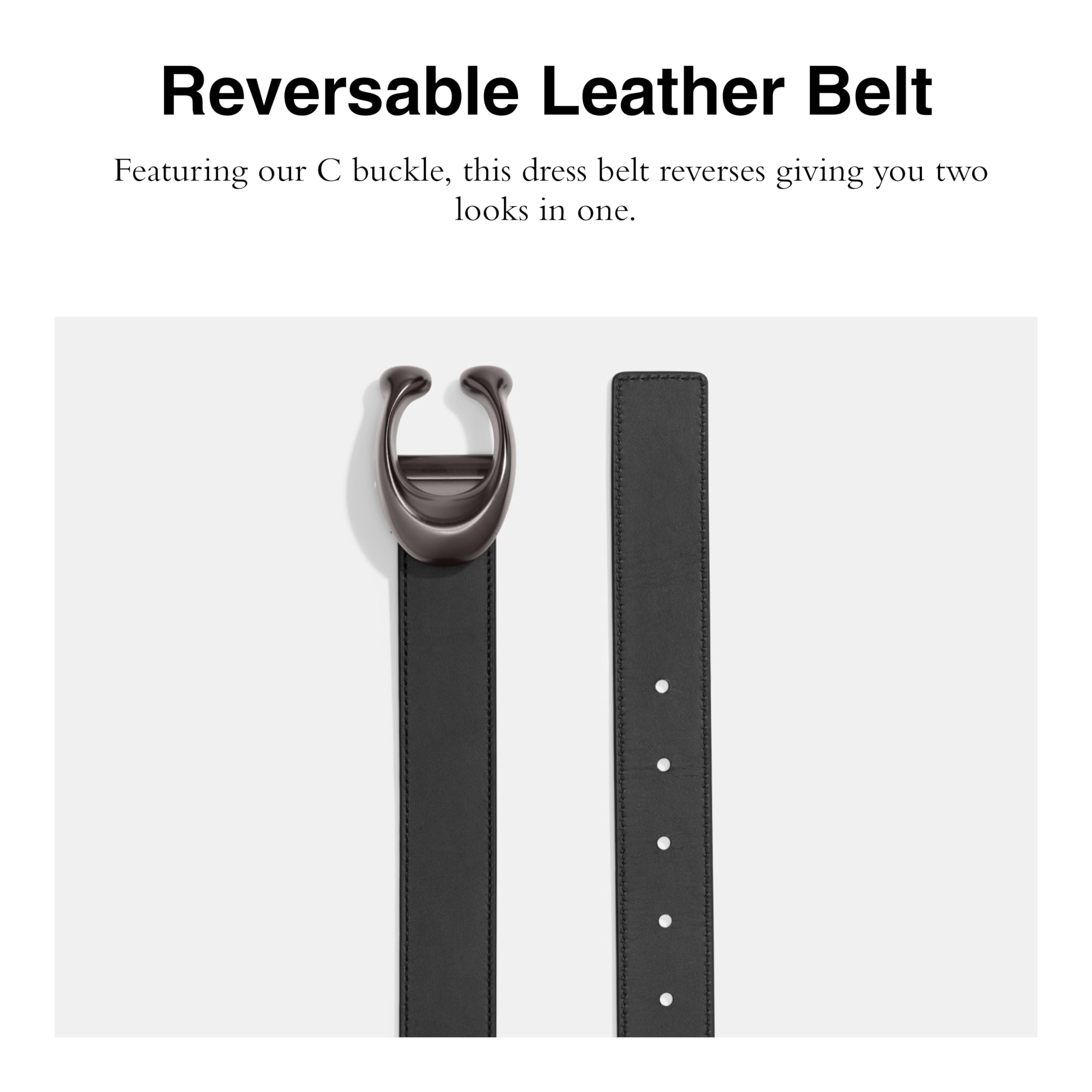 Details: Featuring our C buckle, this dress belt reverses giving you two looks in one. This leather belt is completely customizable—just cut the leather with scissors. 32mmW.