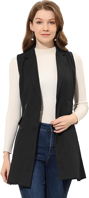 Allegra K Women's Sleeveless Blazer Work Double Breasted Lightweight Belted Long Vest Trench Coat
