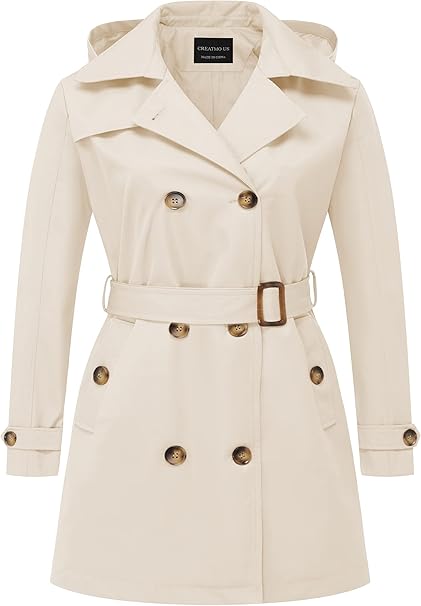 CREATMO US Women's Plus Size Trench Coat Double-Breasted Classic Lapel Overcoat Belted Outerwear Coat with Detachable Hood