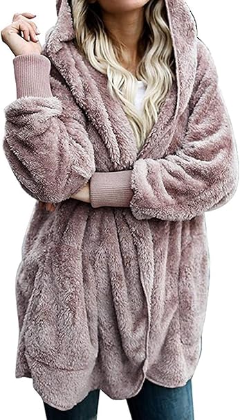 Zilcremo Women Hooded Cardigan Fuzzy Jacket Winter Open Front Fleece Coat Outwear with Pockets