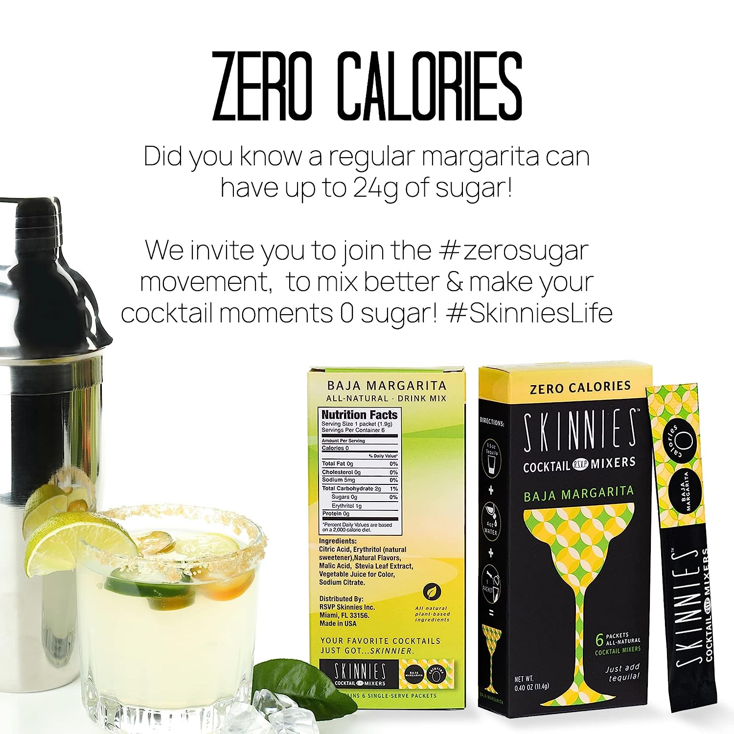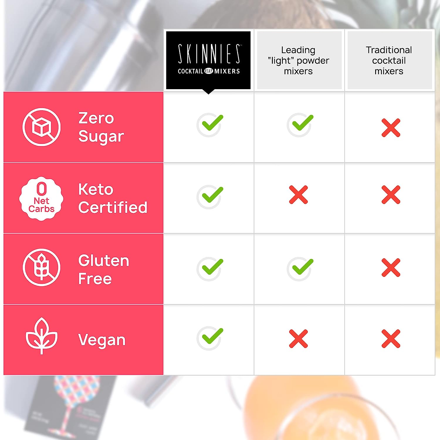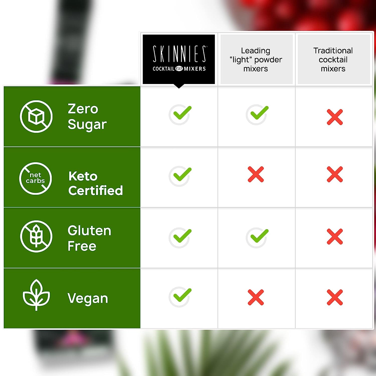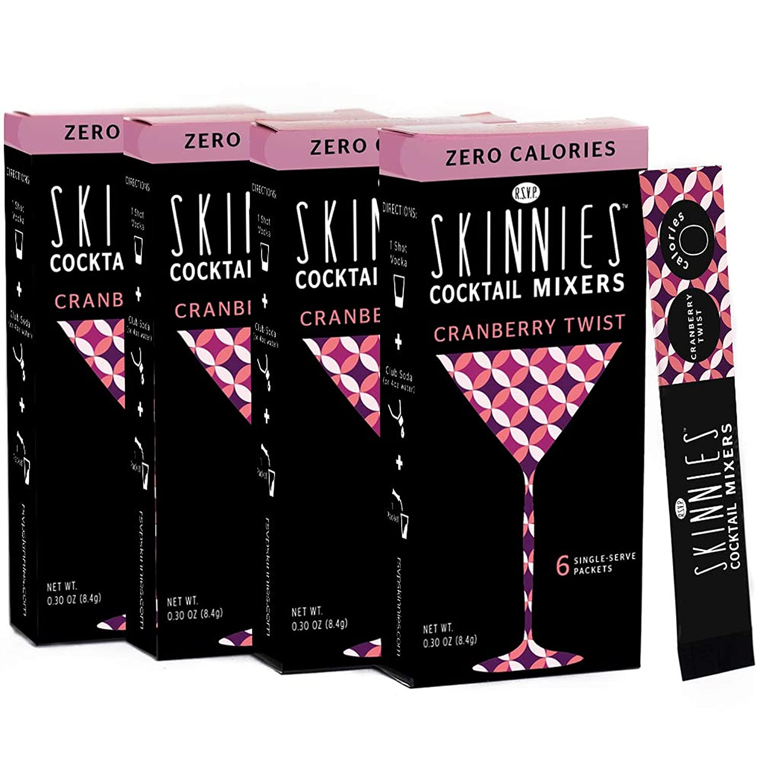 • KETO COCKTAIL MIXERS: At 0 net carbs per serving, Skinnies are great for individuals on the keto diet. The Variety 4-pack contains; 1 box of Cranberry Twist, 1 box of Baja Margarita, 1 box of Moscow Mule, and 1 box of Mojito Twist. There are 6 single serve packets per box. Cheers to making your cocktail moments 0 sugar!