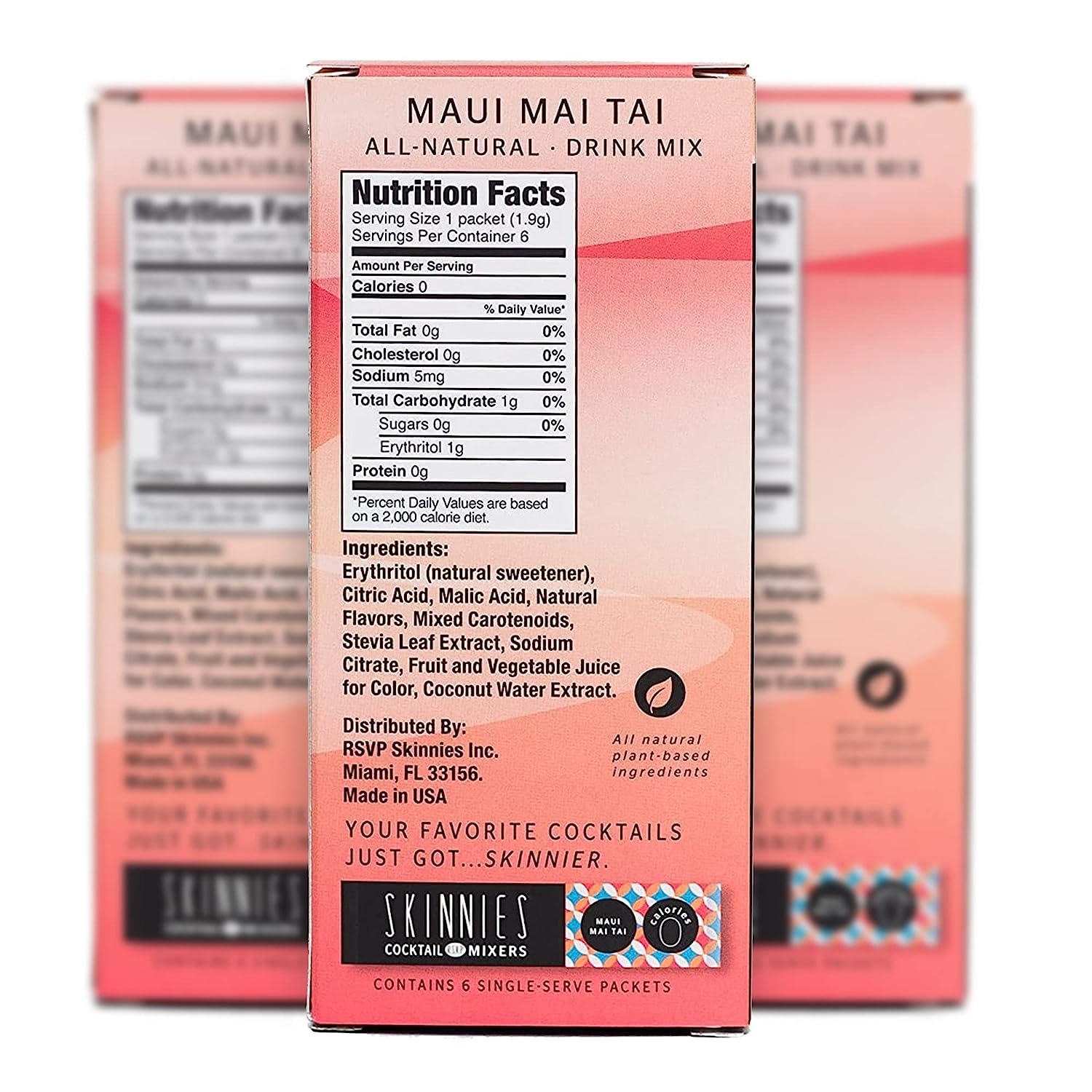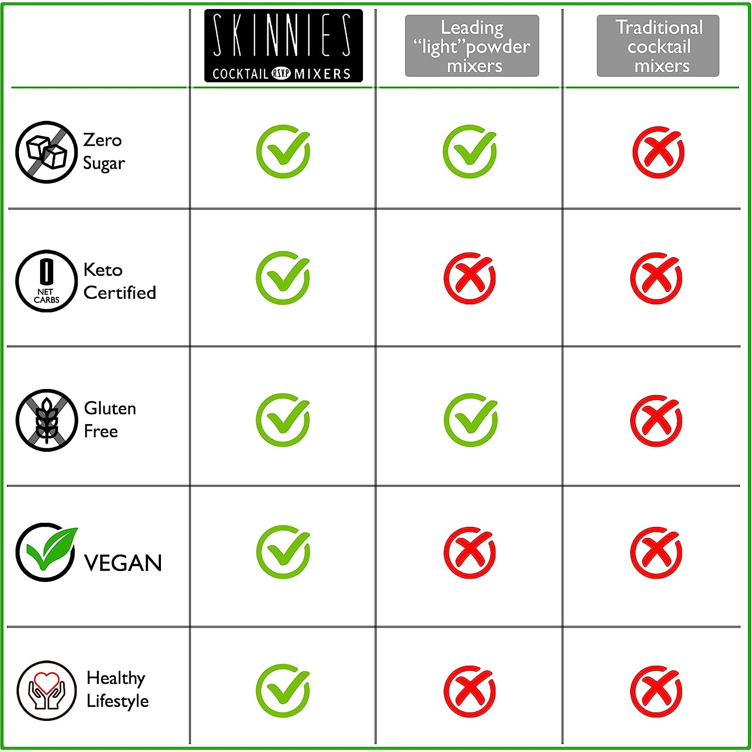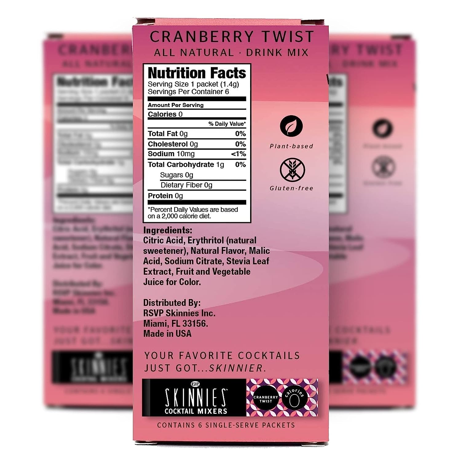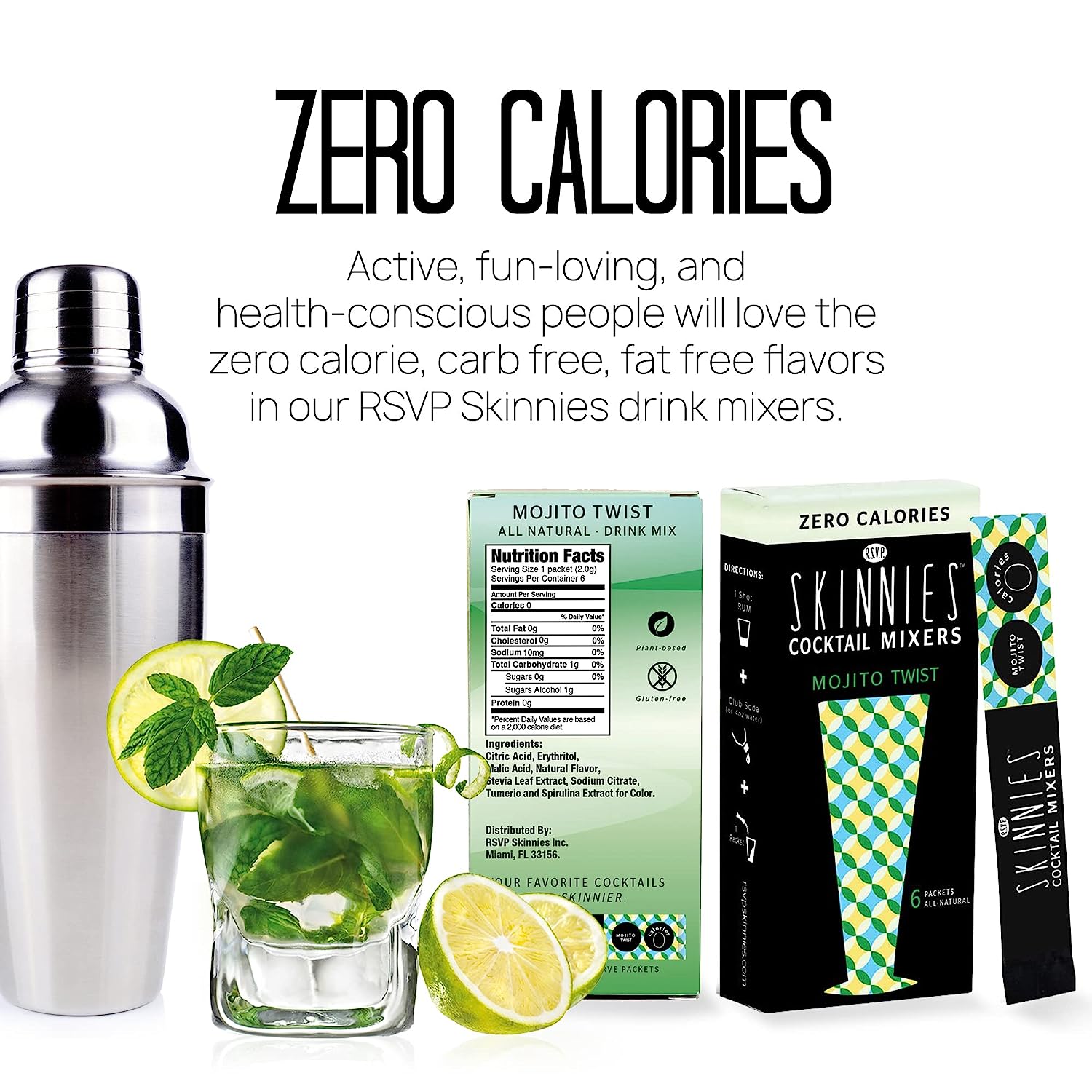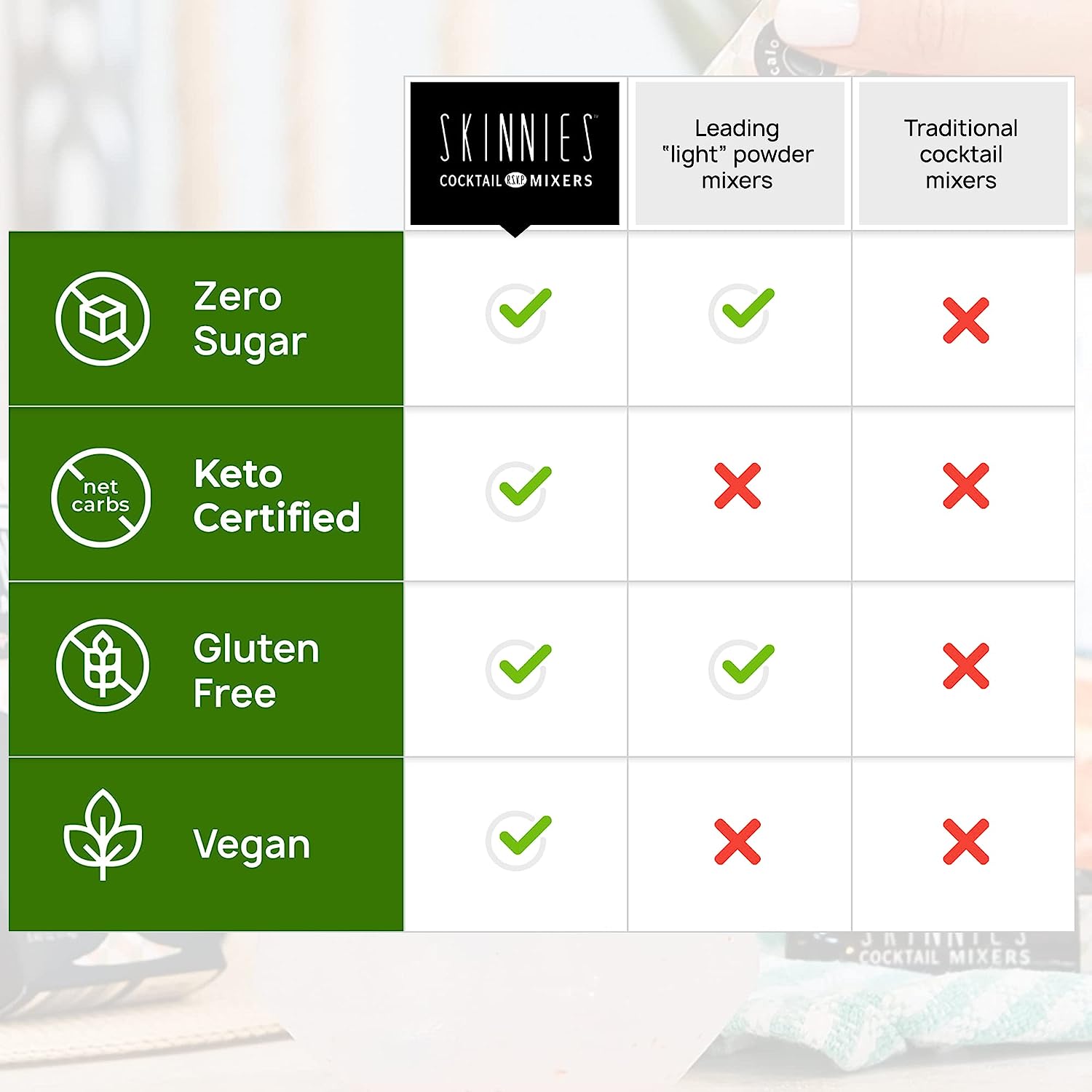 • KETO COCKTAIL MIXERS: At 0 net carbs per serving, Skinnies are great for individuals on the keto diet. The Variety 4-pack contains; 1 box of Cranberry Twist, 1 box of Baja Margarita, 1 box of Moscow Mule, and 1 box of Mojito Twist. There are 6 single serve packets per box. Cheers to making your cocktail moments 0 sugar!