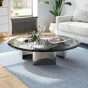 1''ome Round Glass Coffee Table Wedge Coffee Table, Modern Coffee Table with Tempered Glass Top End Table, Heavy Duty Polished Steel Legs Support for Living Room Home Office (Black + Polished Steel)
