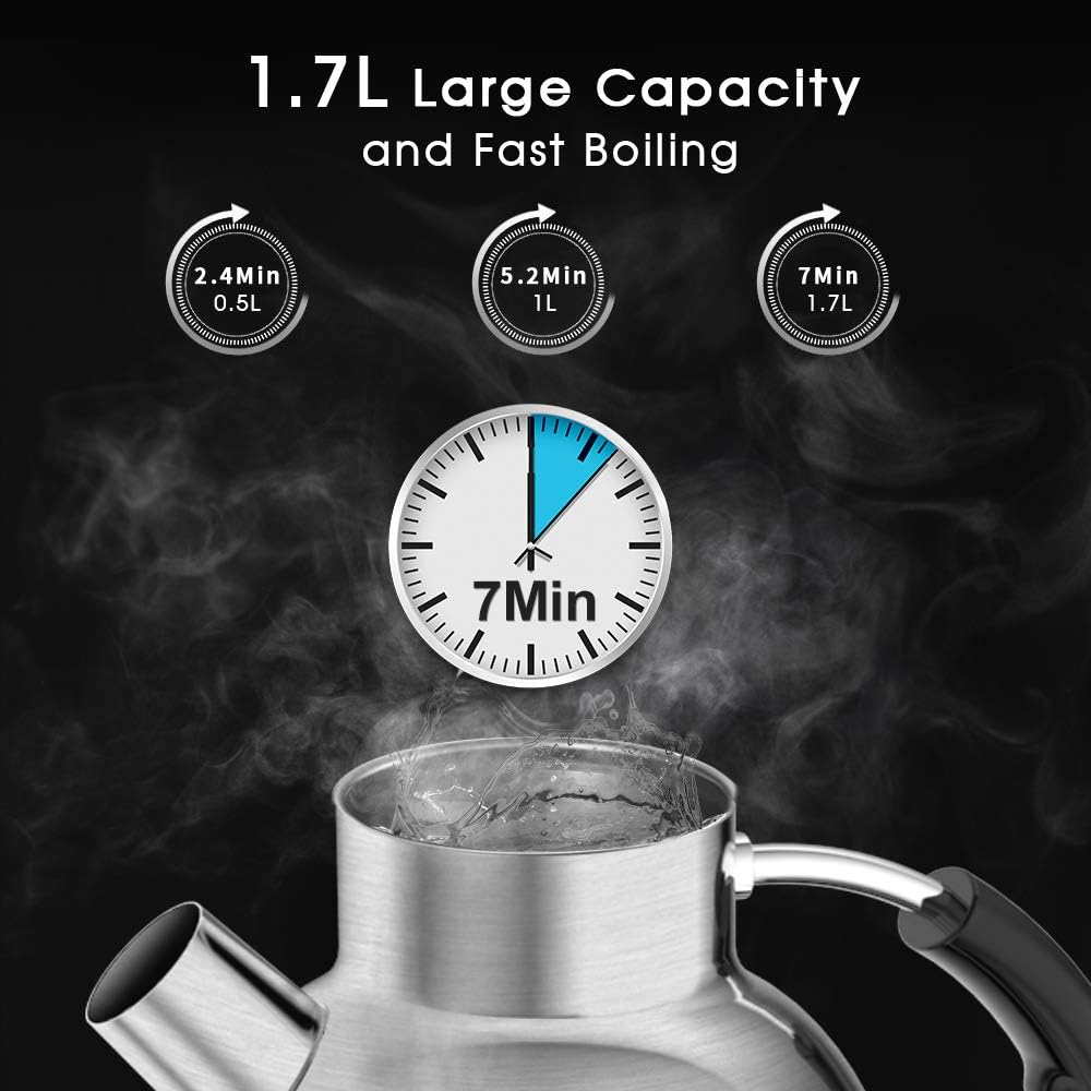 • FAST BOILING - This stainless steel electric kettle has powerful 1500 watte which can boil 1.7 liter water in 5 minutes. You can walk away to focus on other things thanks to the function of auto shut off and boil-dry protection.