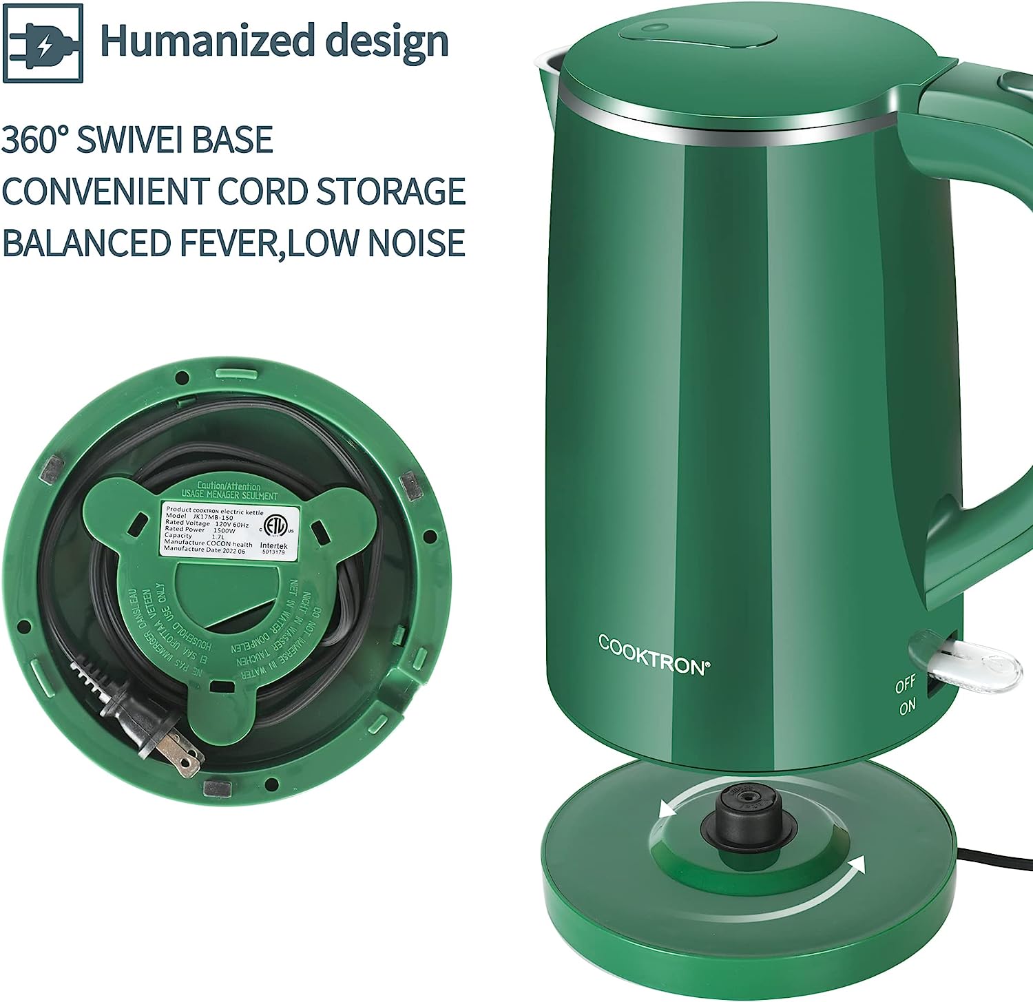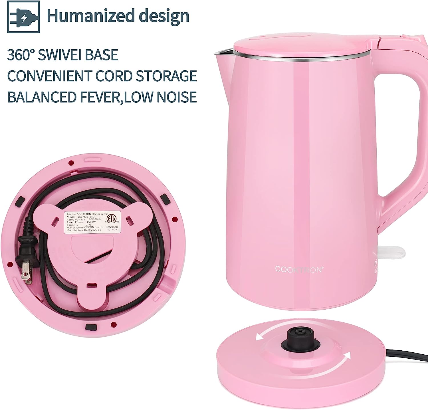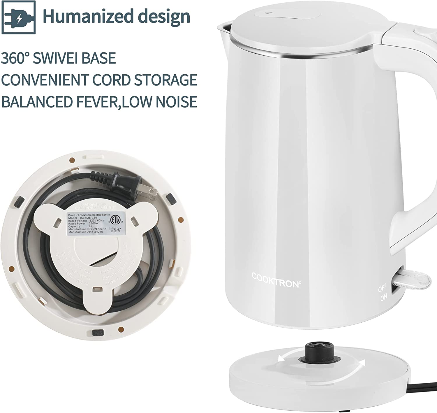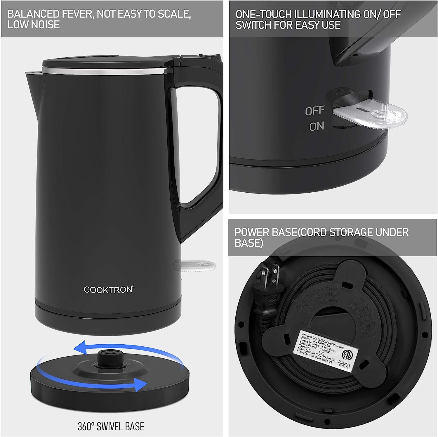• ????-???????? ??????: 100% stainless steel interior, SUPER QUIET OPERATION, BPA-free, 360° rotatable power base design, smudge and fingerprint resistant cool-touch exterior, all these features make COOKTRON hot water kettle a wonderful choice for your home.