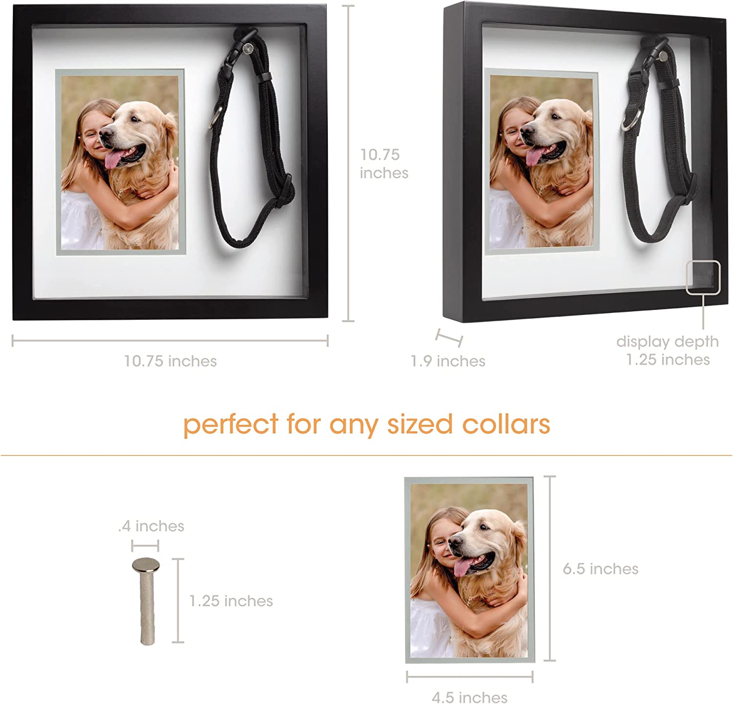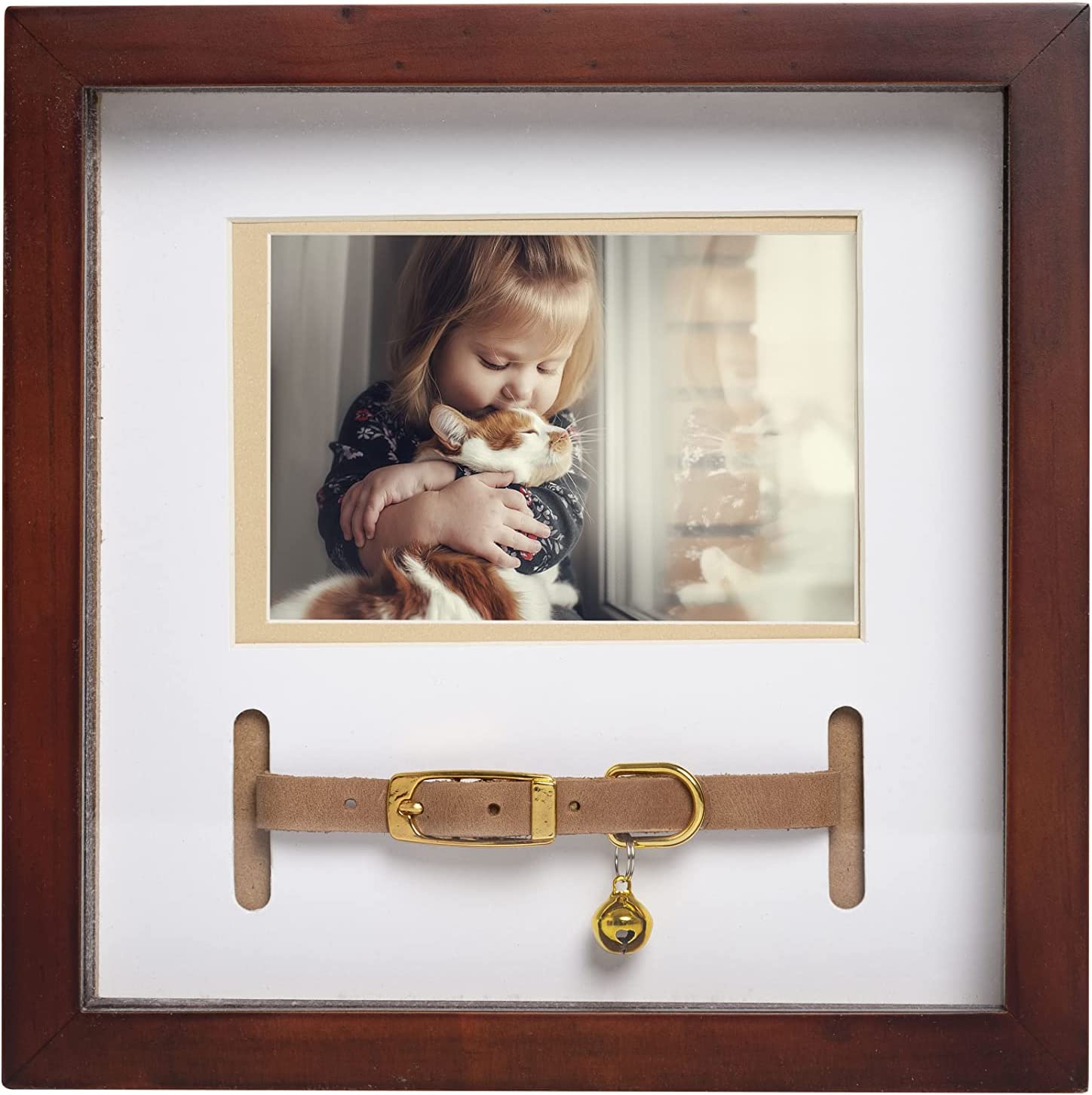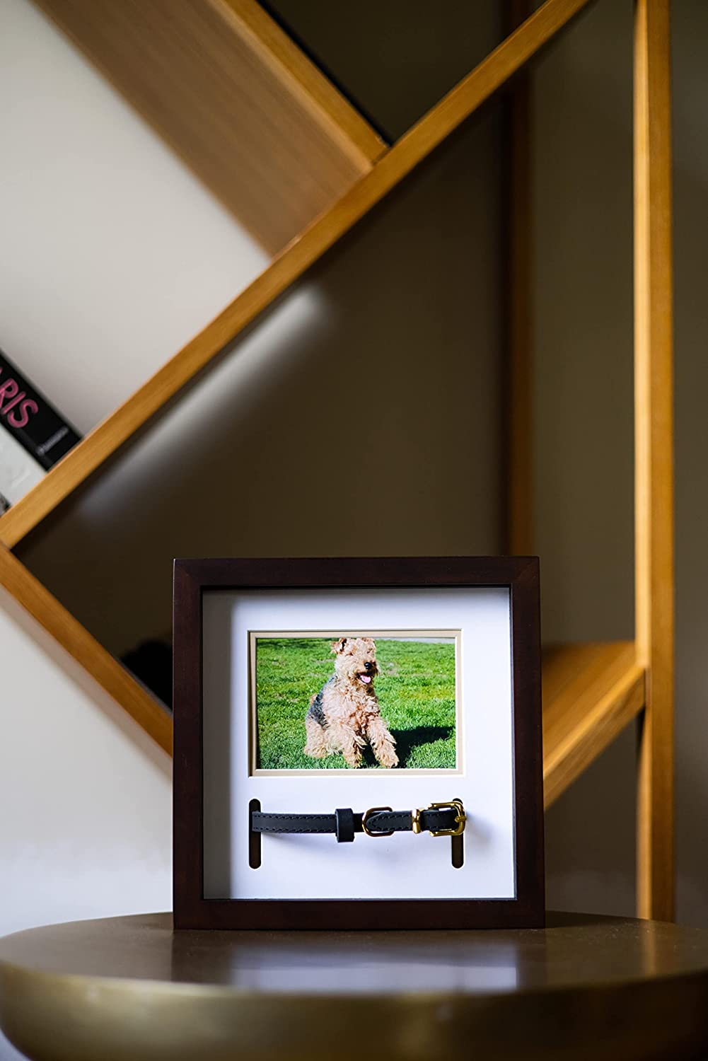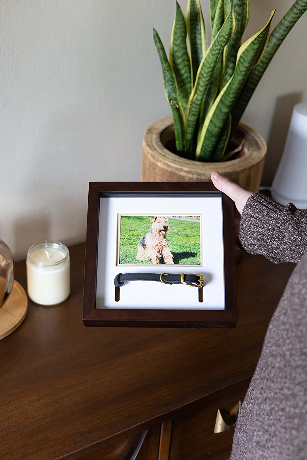 Remember your furry family member forever with Pearhead’s pet collar keepsake frame. This classic, espresso frame is the perfect way to create a lasting memory of our dog, cat, or any other pet who wore a collar. This pet memorial frame includes an opening to place your dog’s collar inside. The shadowbox frame can accommodate collars up to approximately up to 1.5”x9” so it’s great for a small sized pup. You can also display your favorite 4.5”W x 3”H picture of your pet. Display this pet remembrance frame in your home on any table with the included easel or hang on any wall with the included triangle hanger. This memory frame is also small enough to keep on your desk at work. Not a pet owner but know someone who recently lost their beloved furry family member? This frame can be gifted as a dog bereavement gift, cat bereavement gift, cat remembrance gift, or dog remembrance gift. May also be used for other small sized pets who wore a collar. Remember and cherish your pet forever with Pearhead’s pet keepsake collar frame. DIMENSIONS – Frame: 8”W x 8”H x 1.375”D; Display Depth: 0.75”; Photo Insert: 4.5”W x 3”H; Collar Inserts: 1.5”H x 0.25” W; Inner distance between collar inserts: 4.125" W; Outer distance between collar inserts: 4.625"