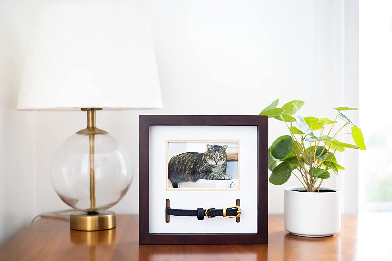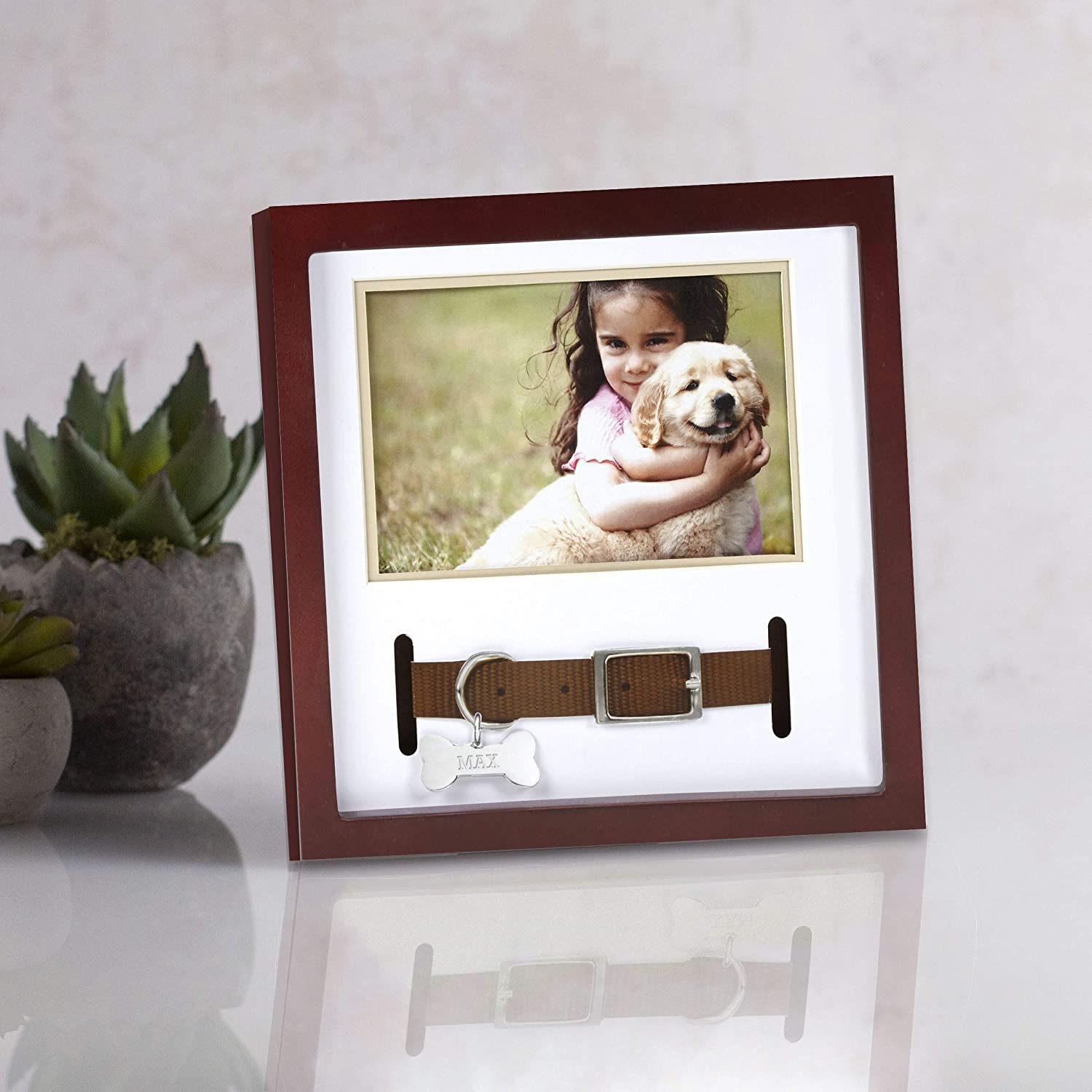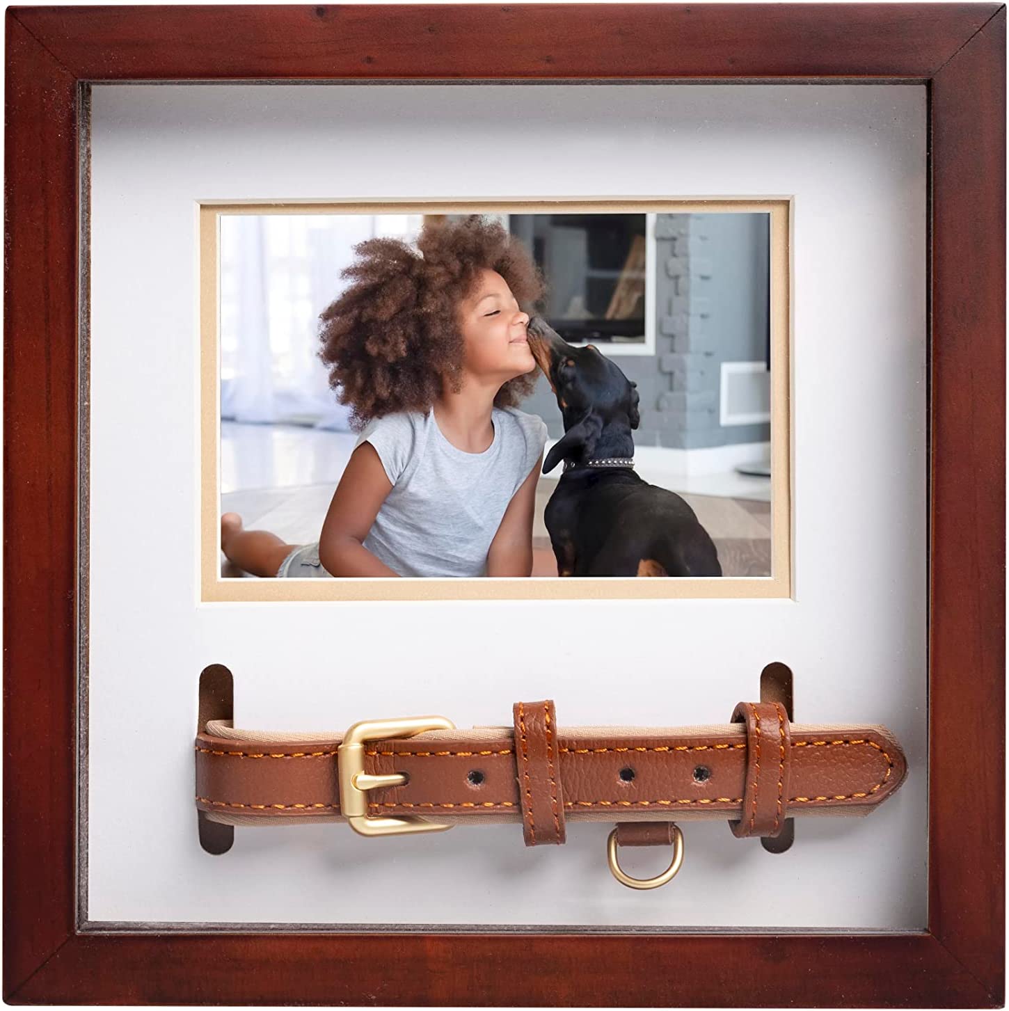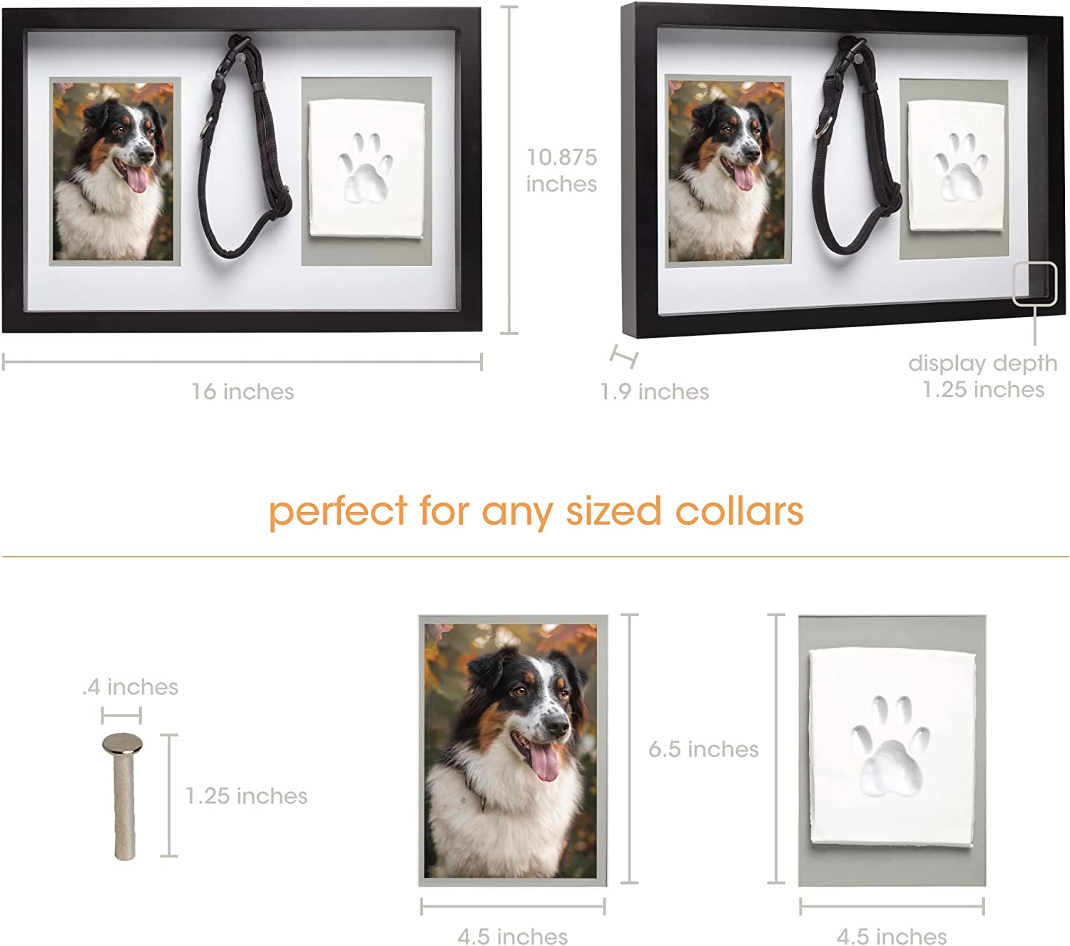 Remember your furry family member forever with Pearhead’s pet collar keepsake frame. This classic, espresso frame is the perfect way to create a lasting memory of our dog, cat, or any other pet who wore a collar. This pet memorial frame includes an opening to place your dog’s collar inside. The shadowbox frame can accommodate collars up to approximately up to 1.5”x9” so it’s great for a small sized pup. You can also display your favorite 4.5”W x 3”H picture of your pet. Display this pet remembrance frame in your home on any table with the included easel or hang on any wall with the included triangle hanger. This memory frame is also small enough to keep on your desk at work. Not a pet owner but know someone who recently lost their beloved furry family member? This frame can be gifted as a dog bereavement gift, cat bereavement gift, cat remembrance gift, or dog remembrance gift. May also be used for other small sized pets who wore a collar. Remember and cherish your pet forever with Pearhead’s pet keepsake collar frame. DIMENSIONS – Frame: 8”W x 8”H x 1.375”D; Display Depth: 0.75”; Photo Insert: 4.5”W x 3”H; Collar Inserts: 1.5”H x 0.25” W; Inner distance between collar inserts: 4.125" W; Outer distance between collar inserts: 4.625"