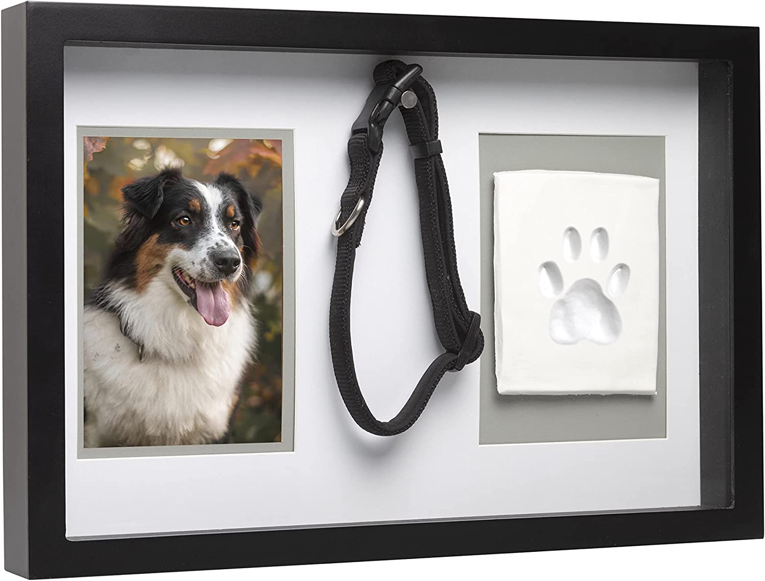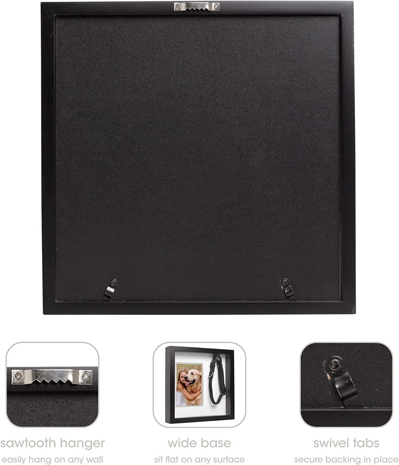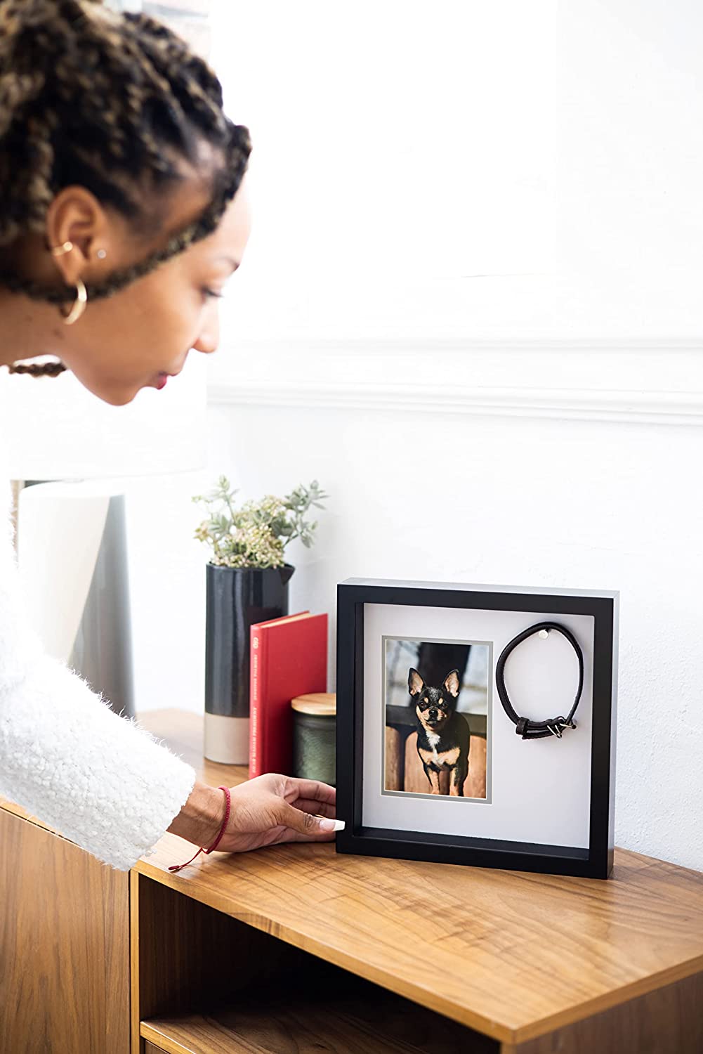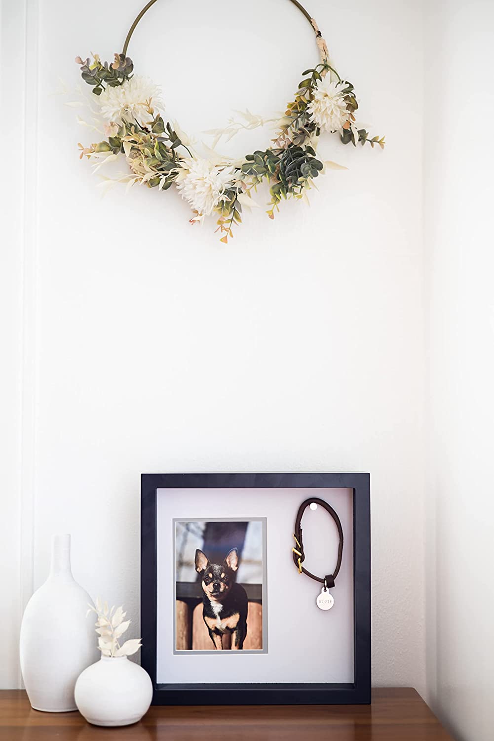Remember your furry family member forever with Pearhead’s pet collar keepsake frame. This classic, espresso frame is the perfect way to create a lasting memory of our dog, cat, or any other pet who wore a collar. This pet memorial frame includes an opening to place your dog’s collar inside. The shadowbox frame can accommodate collars up to approximately up to 1.5”x9” so it’s great for a small sized pup. You can also display your favorite 4.5”W x 3”H picture of your pet. Display this pet remembrance frame in your home on any table with the included easel or hang on any wall with the included triangle hanger. This memory frame is also small enough to keep on your desk at work. Not a pet owner but know someone who recently lost their beloved furry family member? This frame can be gifted as a dog bereavement gift, cat bereavement gift, cat remembrance gift, or dog remembrance gift. May also be used for other small sized pets who wore a collar. Remember and cherish your pet forever with Pearhead’s pet keepsake collar frame. DIMENSIONS – Frame: 8”W x 8”H x 1.375”D; Display Depth: 0.75”; Photo Insert: 4.5”W x 3”H; Collar Inserts: 1.5”H x 0.25” W; Inner distance between collar inserts: 4.125" W; Outer distance between collar inserts: 4.625"