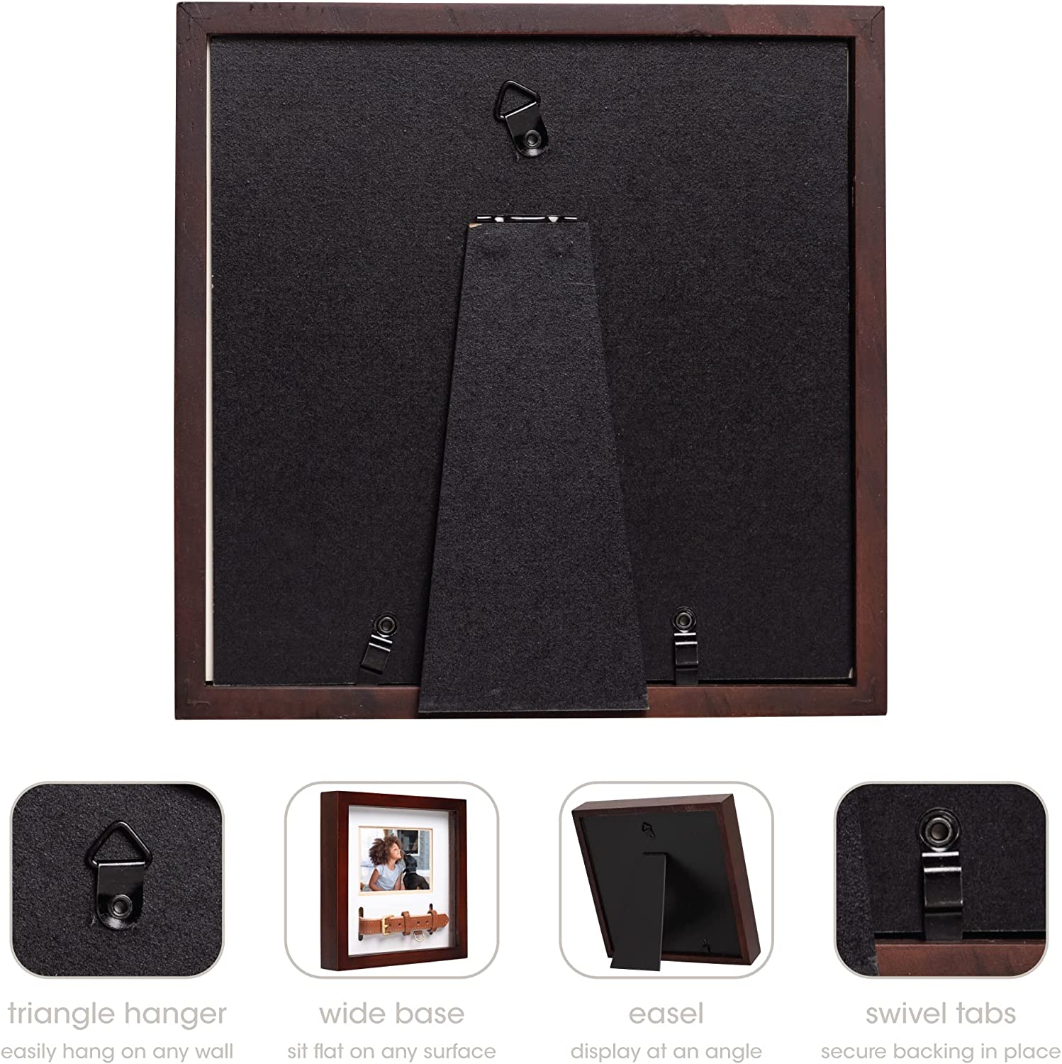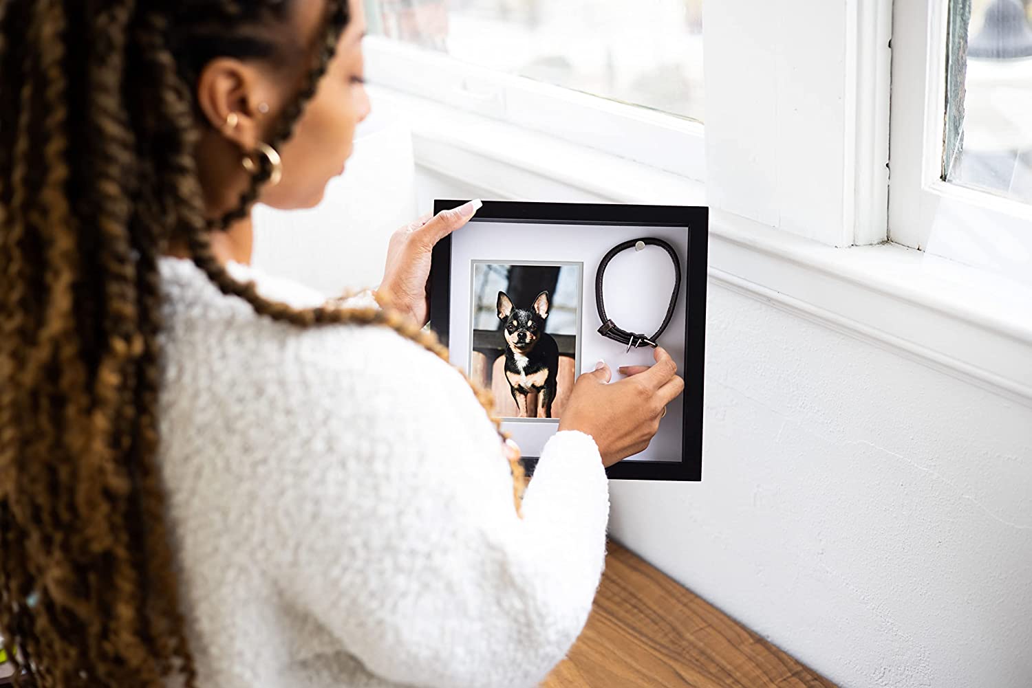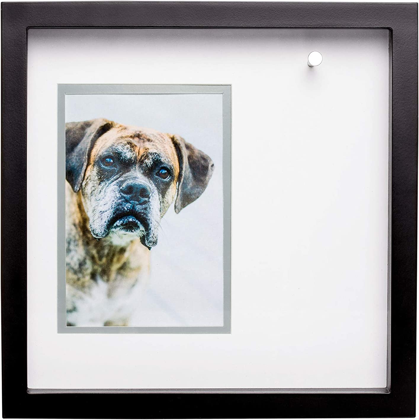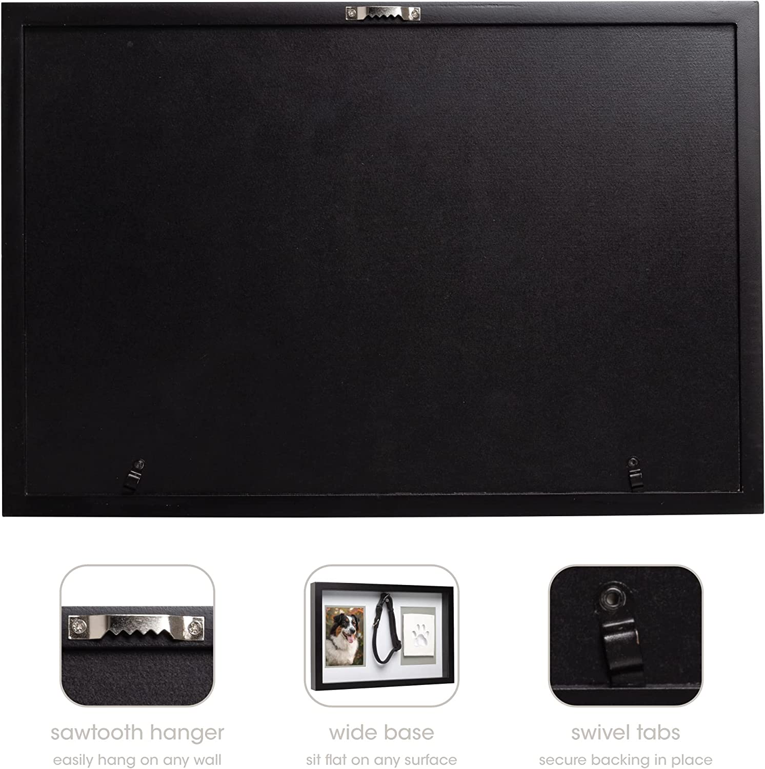 Remember your furry family member forever with Pearhead’s pet collar keepsake frame. This classic, espresso frame is the perfect way to create a lasting memory of our dog, cat, or any other pet who wore a collar. This pet memorial frame includes an opening to place your dog’s collar inside. The shadowbox frame can accommodate collars up to approximately up to 1.5”x9” so it’s great for a small sized pup. You can also display your favorite 4.5”W x 3”H picture of your pet. Display this pet remembrance frame in your home on any table with the included easel or hang on any wall with the included triangle hanger. This memory frame is also small enough to keep on your desk at work. Not a pet owner but know someone who recently lost their beloved furry family member? This frame can be gifted as a dog bereavement gift, cat bereavement gift, cat remembrance gift, or dog remembrance gift. May also be used for other small sized pets who wore a collar. Remember and cherish your pet forever with Pearhead’s pet keepsake collar frame. DIMENSIONS – Frame: 8”W x 8”H x 1.375”D; Display Depth: 0.75”; Photo Insert: 4.5”W x 3”H; Collar Inserts: 1.5”H x 0.25” W; Inner distance between collar inserts: 4.125" W; Outer distance between collar inserts: 4.625"