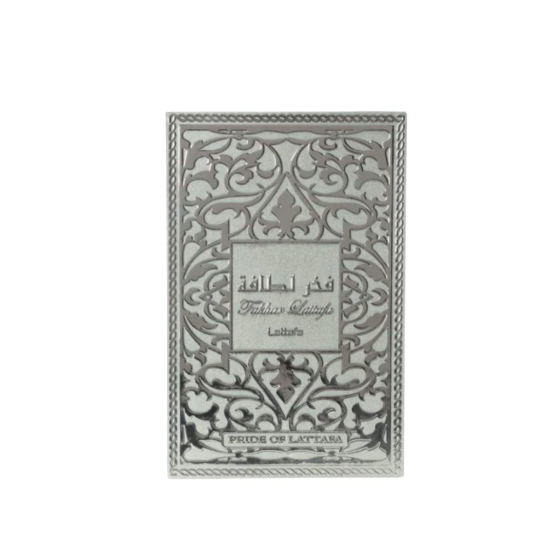 Fakhar Lattafa Silver highlights a Fougere - woody union along with elegant notes of violet leaf, masculine nutmeg, and bergamot. The heart accentuates clary sage, tart geranium, and orange blossom finely spiced with coriander, while Tonka patchouli, vanilla, and sandalwood linger in trail, which attracts out attention with strong creamy shades. Top Notes: Silkwood Blossom, Mandarin Orange, and Orange Blossom Middle Note: Night Blooming Cereus and Bulgarian Rose Base Note: Vanilla, Sandalwood, and Tonka Bean