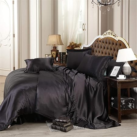 3Pc Silk Satin Comforter Set 1-Piece Quilted Box Stitching Comforter with 2 Pillow Case 300 GSM Microfiber Fill (California King/King 94''x104'', Black)