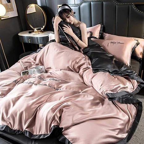 4 Piece Comforter Set, Light Luxury ice Silk Four-Piece Girl Heart Princess Style Silk Bed Sheet Duvet Cover-Champagne and Dark Gray_2.0m Bed Four-Piece Suit Suitable for 220x240