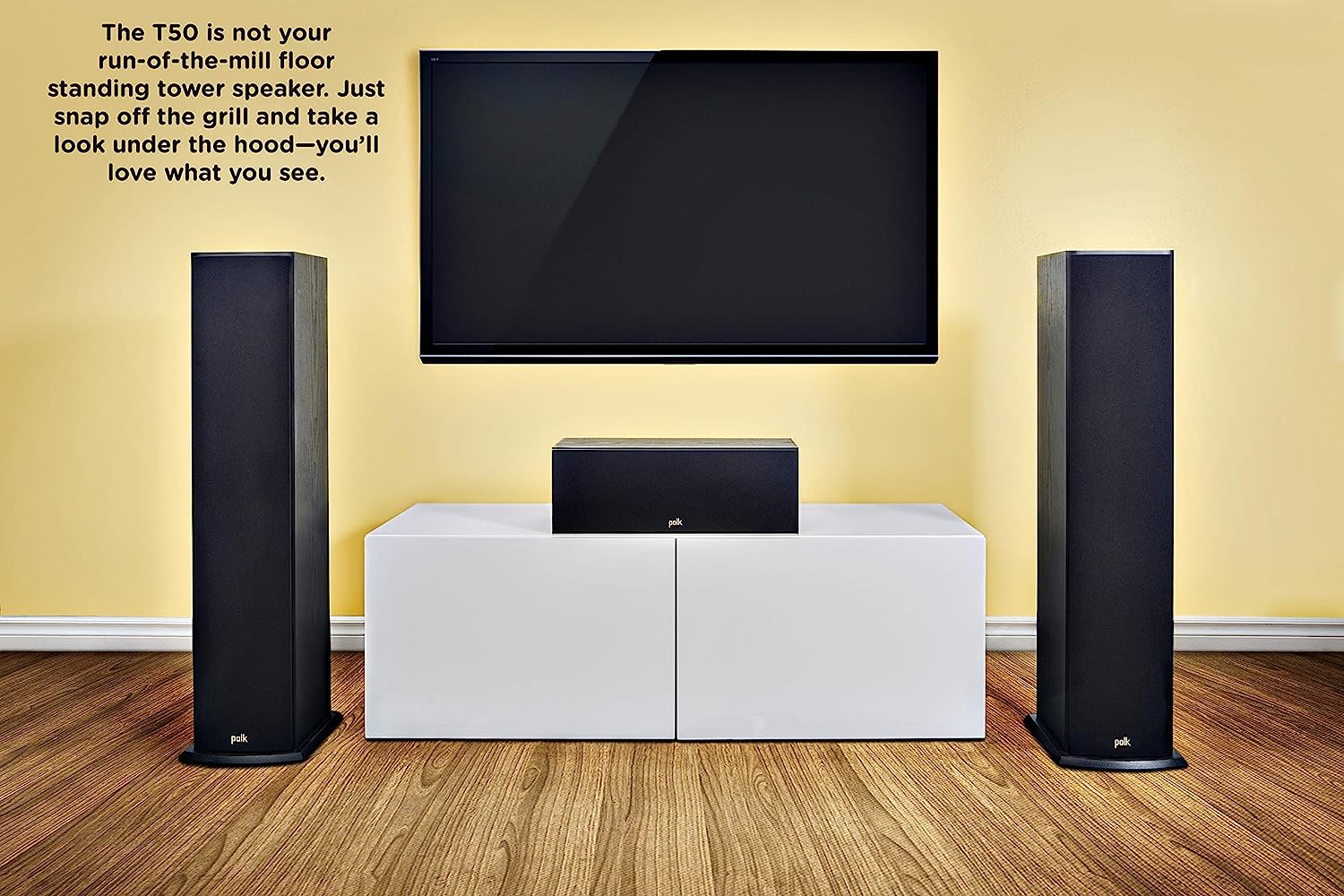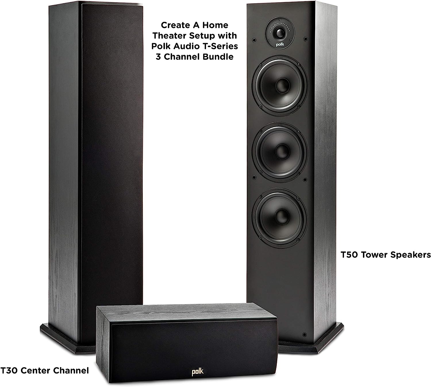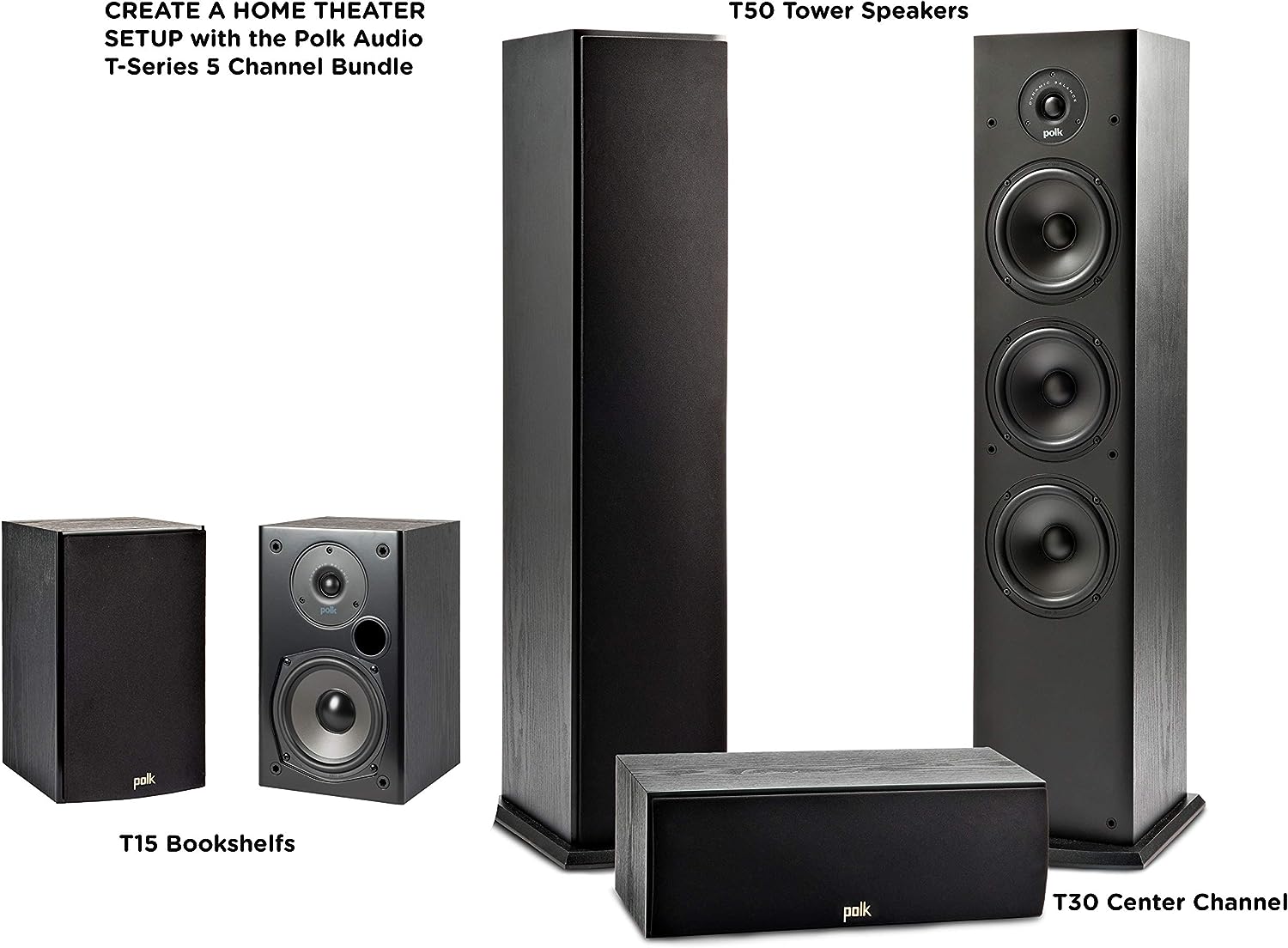 5.1 HOME THEATER SETUP with the complete range of T-series speakers from Polk with two T50 Tower Speakers, one T30 Center Channel, two T15 Bookshelf speakers and a subwoofer.With these value-priced speakers, you can now enjoy premium acoustics, high quality construction, easy setup and a spectacular theater experience right at home.