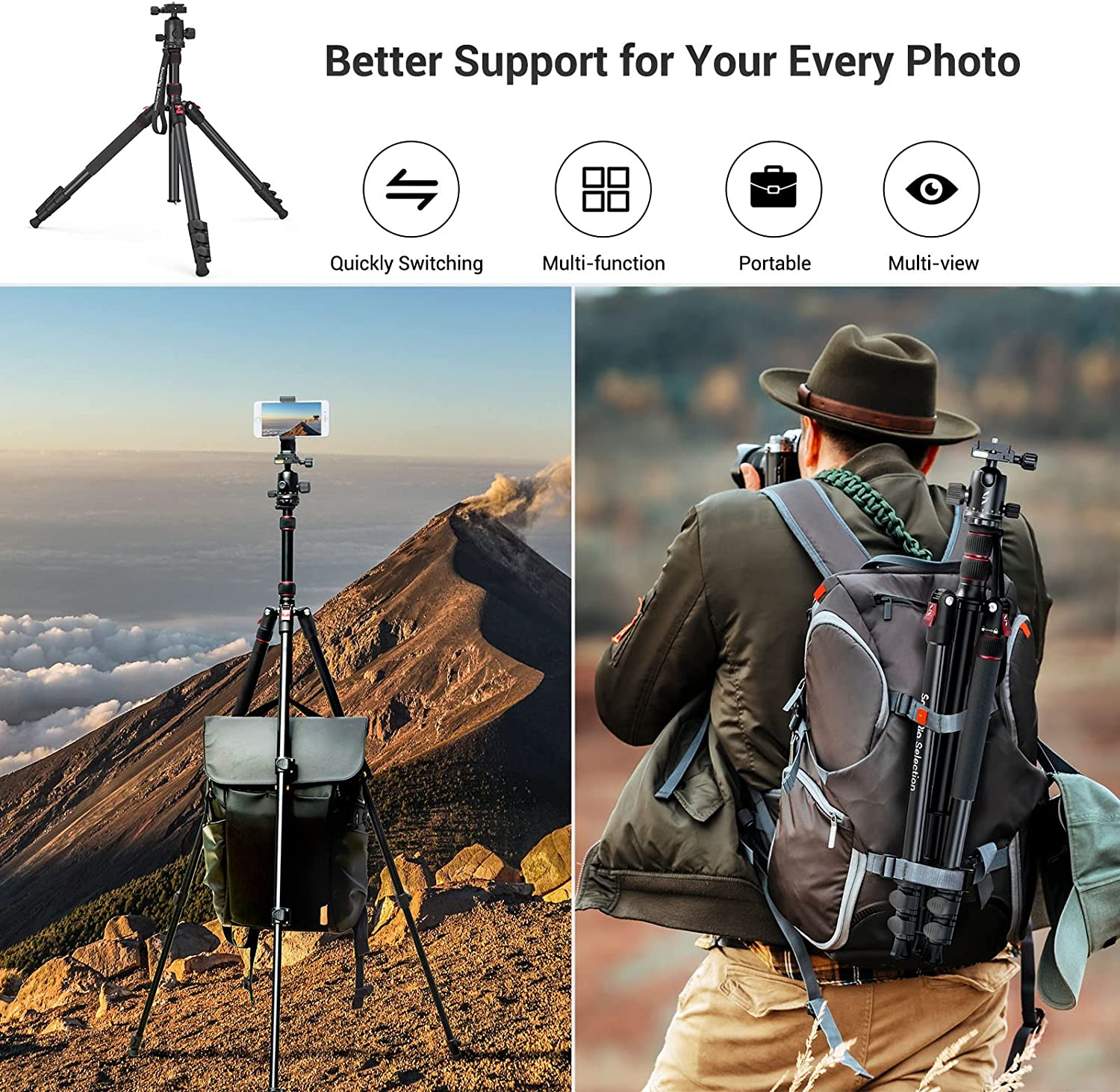 • 2 in 1 Tripod &Monopod: You can easily turn the aluminum tripod into a monopod according to your needs, this tripod is a good companion for your hiking or traveling.