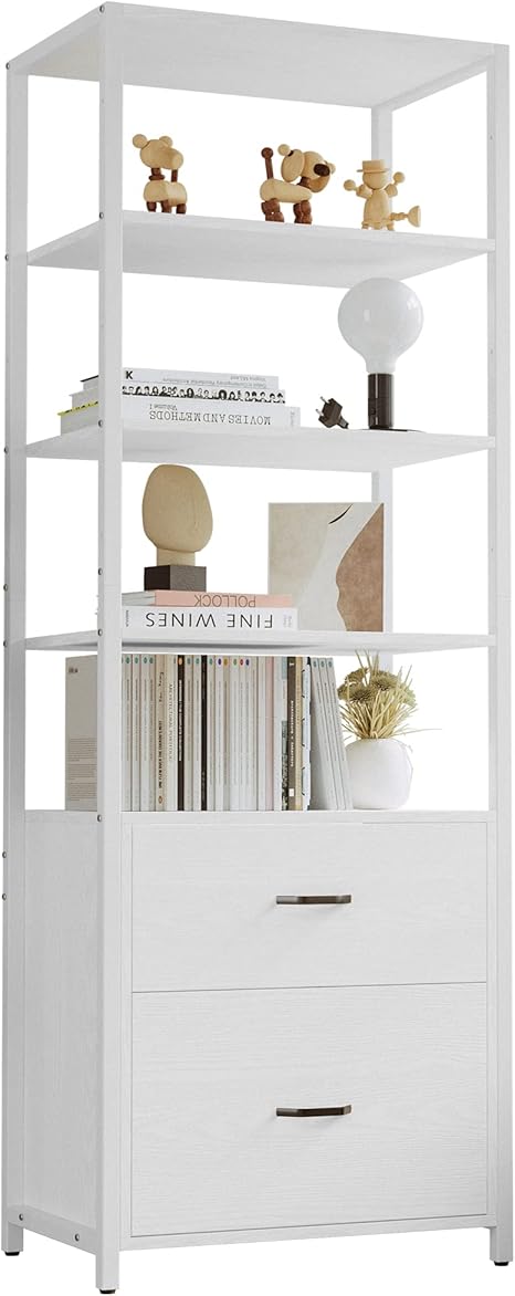 IRONCK Industrial Bookcase with File Cabinet Drawers, 71.6 in Tall Bookshelf 5 Tier, Freestanding Storage Home Office Cabinet Organizer, Rustic Home Decor, White