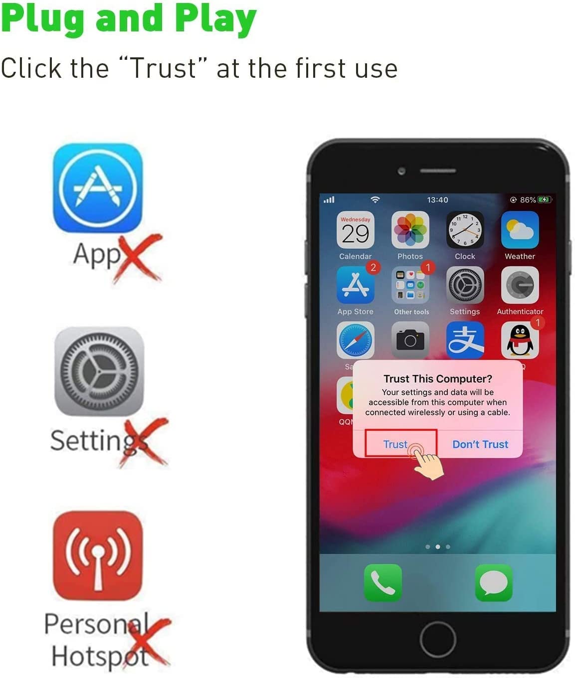 • 【Note】 If your mobile phone is connected to the product, there is no reaction, please check whether there is the following situation: 1. Whether to remove the phone case, the port is completely connected. 2. Whether to connect 5V/2A power supply. 3. Whether to click "Trust".