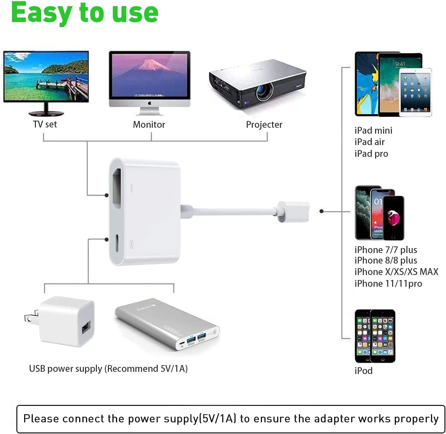 • 【Extensive Compatibility】 Lightning to HDMI Adapter enable support for multiple devices,such as iPhone 11/11 Pro/11 Pro Max,iPhone X/XR/XS/XS Max,iPhone 8 7 6 Plus,iPhone 5/5S/5C/SE 2020;iPad,iPod and other the Lightning interface devices,it supports iOS 13 system and before.