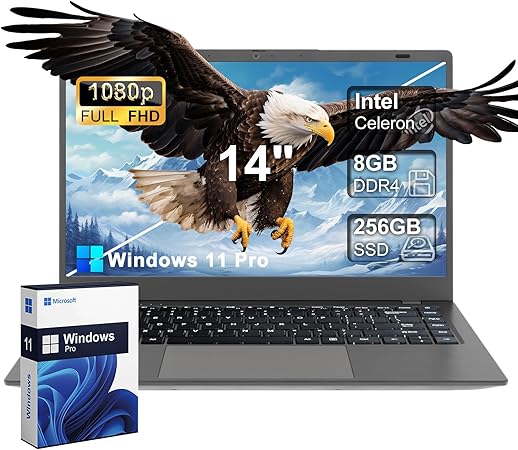 2025 Laptop Computer 14 Inch FHD 1080p, Windows 11 Pro for School College Students Business, 8GB DDR4 RAM, 256GB SSD, Dual-Core Intel Celeron (Up to 2.6 GHz), USB, HDMI, Webcam, Wi-Fi, Bluetooth 5.0
