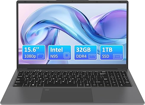 Student Laptop, 1TB M2 PCIe NVMe SSD, 4C4T 1.7-3.4GHz Intel N95 CPU, 15.6" FHD IPS LCD Screen, Privacy Shutter, Backlit Keyboard, Fingerprint Reader, USB-Ax3, USB-C, Win11 Pro (32GB DDR4 RAM)