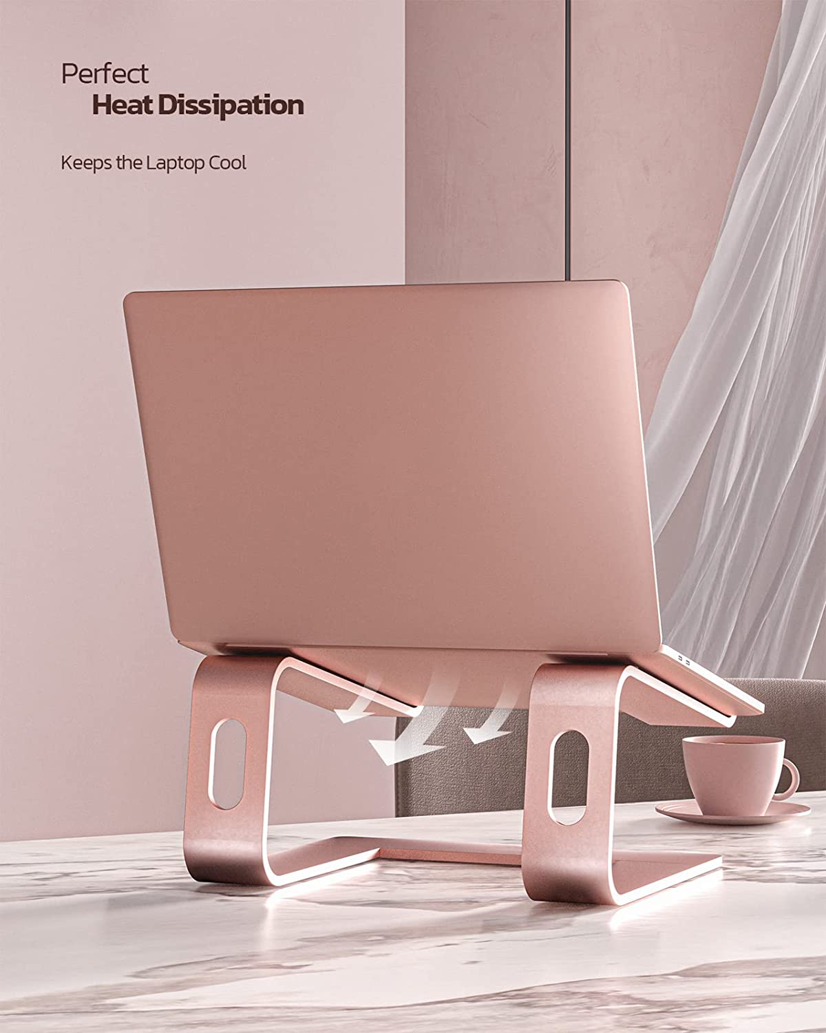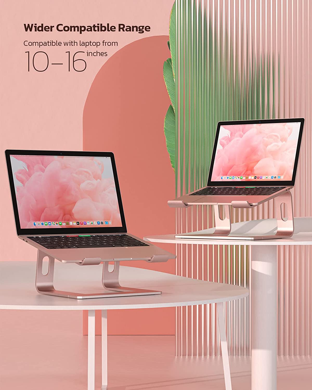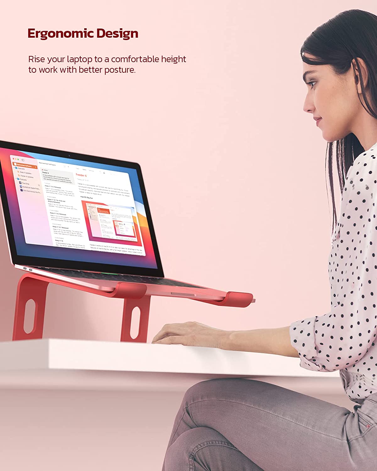 • 【Sturdy & Protective Design】 Made with premium 5mm aluminum alloy this laptop stand is study and is able to support laptop weighing up to 22 lbs (10kg) and with the large rubber pads on the surface it will hold it steady too. We also have pads on the bottom to prevent it from sliding and protecting your laptop from any unwanted harm.