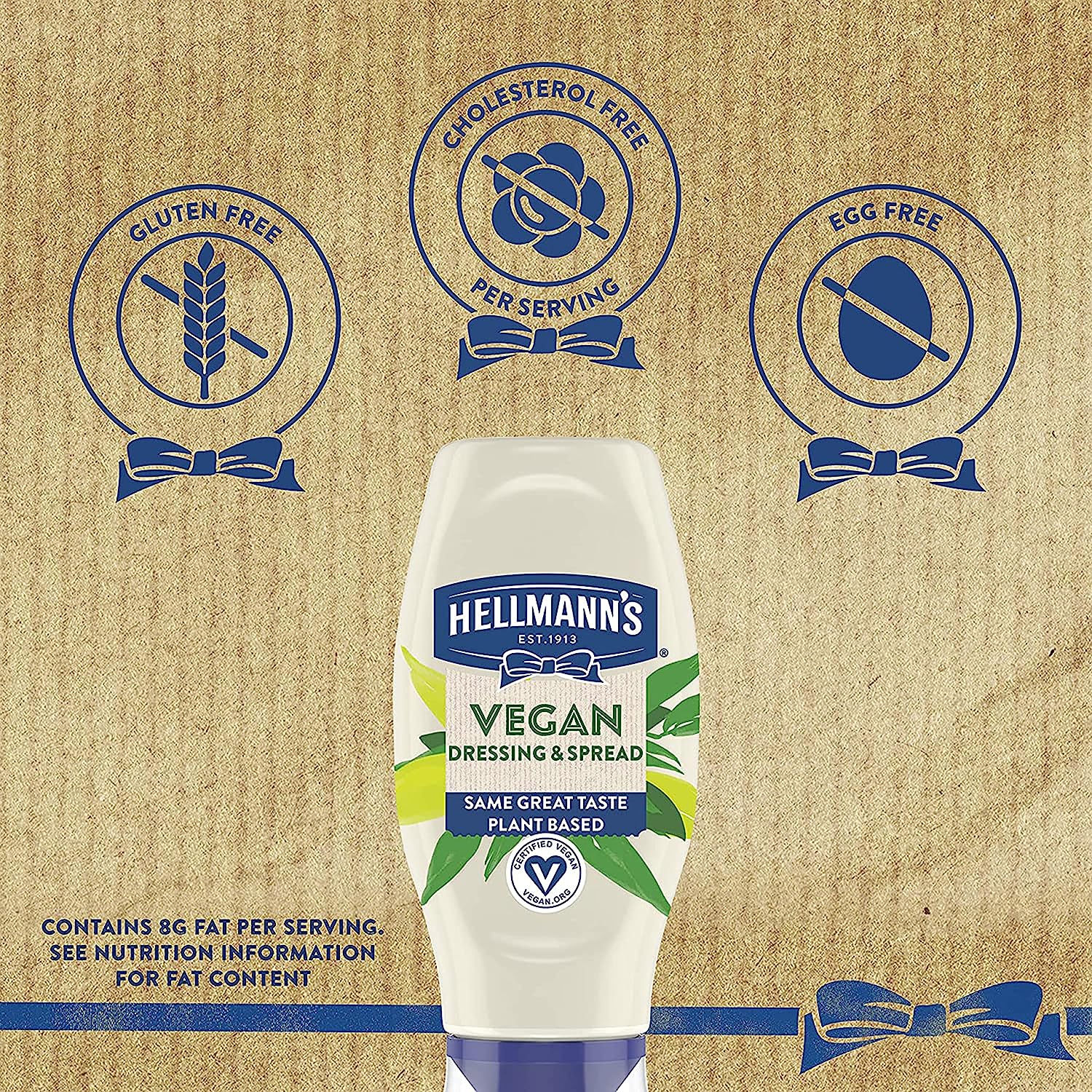 • Hellmann's Vegan Dressing & Spread is gluten free and cholesterol free (contains 8g of fat per serving)