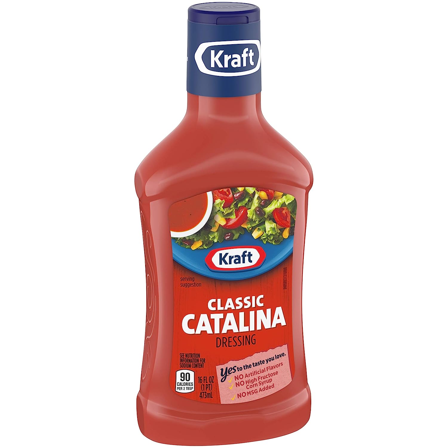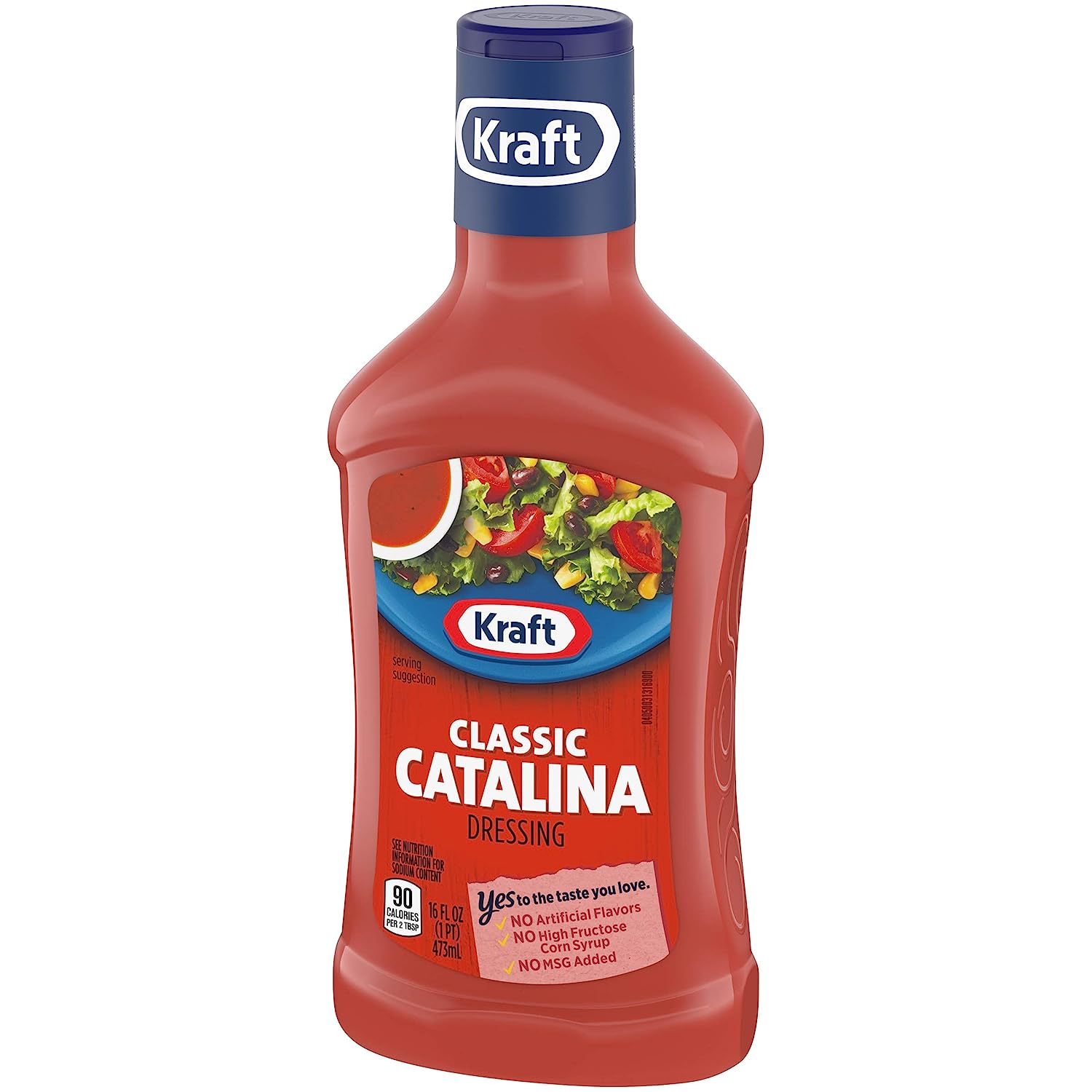 Kraft Classic Catalina Dressing adds tangy, zesty flavor to almost anything. Bursting with tomato puree, vinegar and spices, this family favorite Catalina dressing delivers mouthwatering flavor in every bite. Pre-mixed for convenience, this dressing is ready to enjoy after a quick shake. Our delicious Catalina dressing is made with no artificial flavors or high fructose corn syrup and no added MSG with only 90 calories per serving. Try this dressing on salads and sandwiches or as a dipping sauce or marinade for chicken and veggies. Catalina taco salad is a great dinner option, or try making pasta salad with Catalina dressing for a refreshing side dish. Each 16 fluid ounce squeezable dressing bottle comes with a convenient applicator top so you can add the perfect amount to all your favorite dishes.