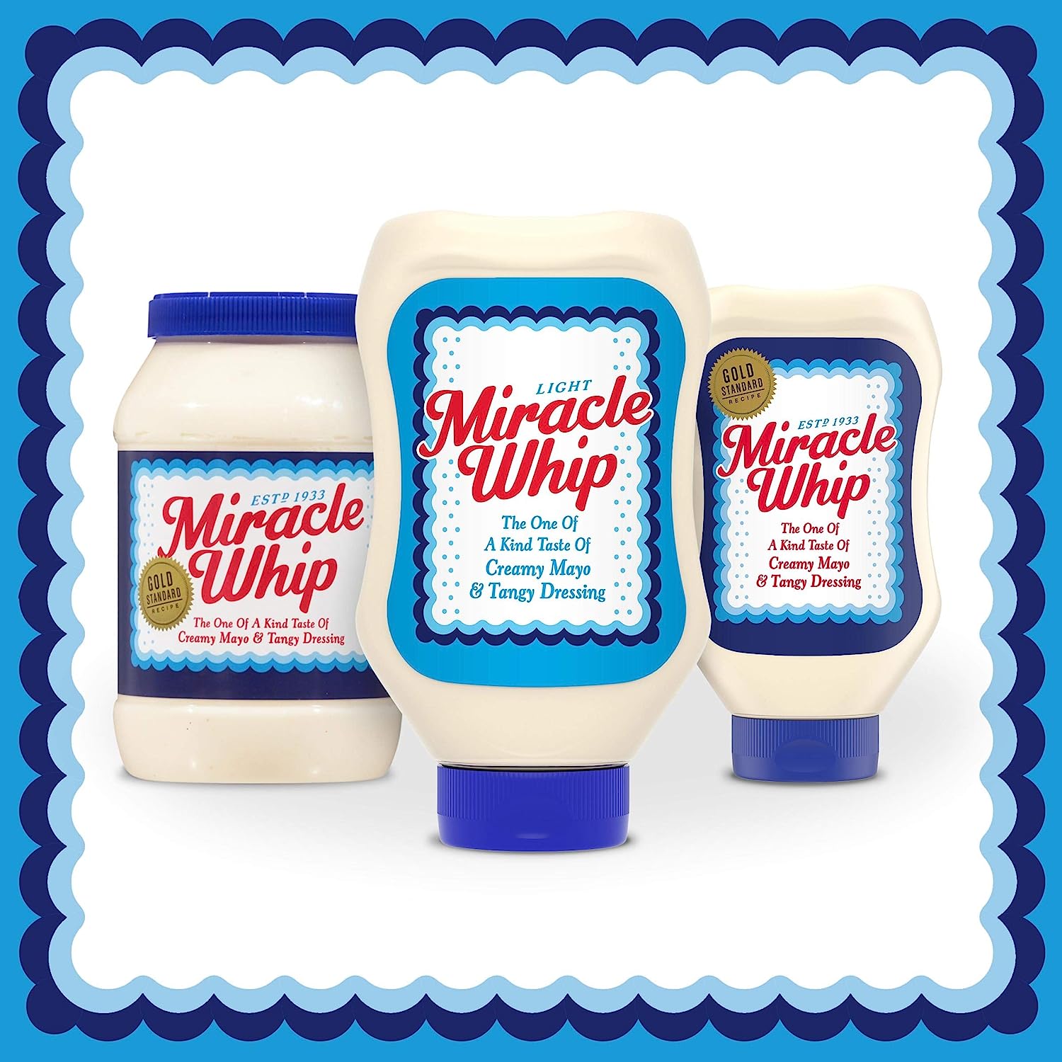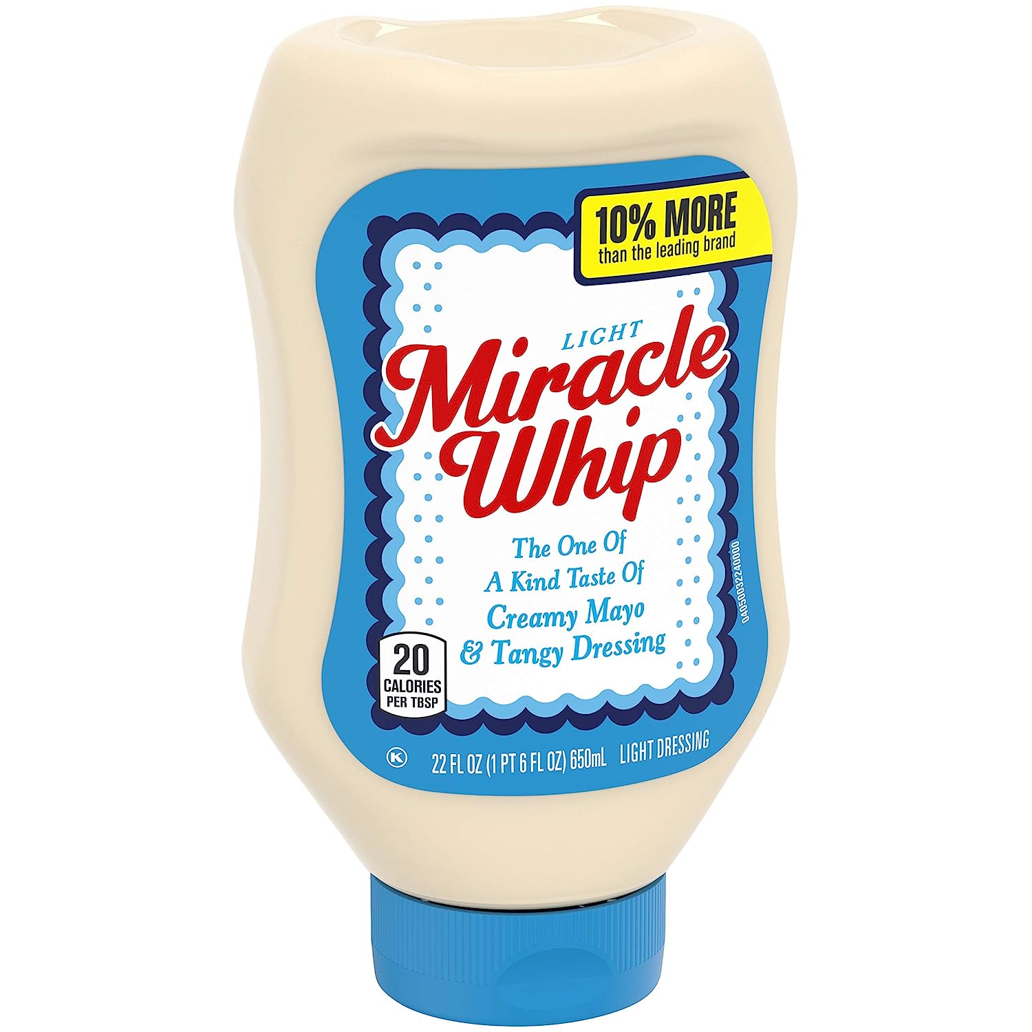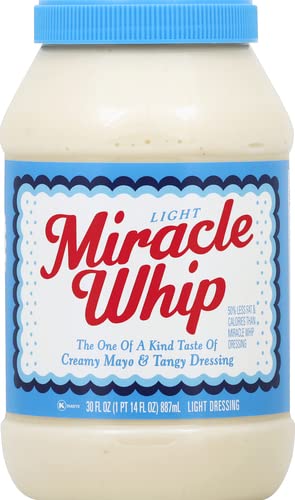 Miracle Whip Light Dressing adds cool, zesty flavor to almost anything. Bursting with tangy vinegar and a medley of spices, this family favorite dressing and condiment delivers creamy texture and delicious flavor in every bite. Light Miracle Whip is thick enough for spreading or dipping, and it adds a wonderful texture to salads. With 20 calories per serving, youll feel good about adding Miracle Whip dressing to all your favorite appetizers and entrees. Try light Miracle Whip for sandwiches and salads, in your favorite chicken recipe or as a creamy burger sauce. It also makes a tasty secret ingredient in deviled eggs and potato salad. This dressing is packaged in a resealable 30 fluid ounce jar.