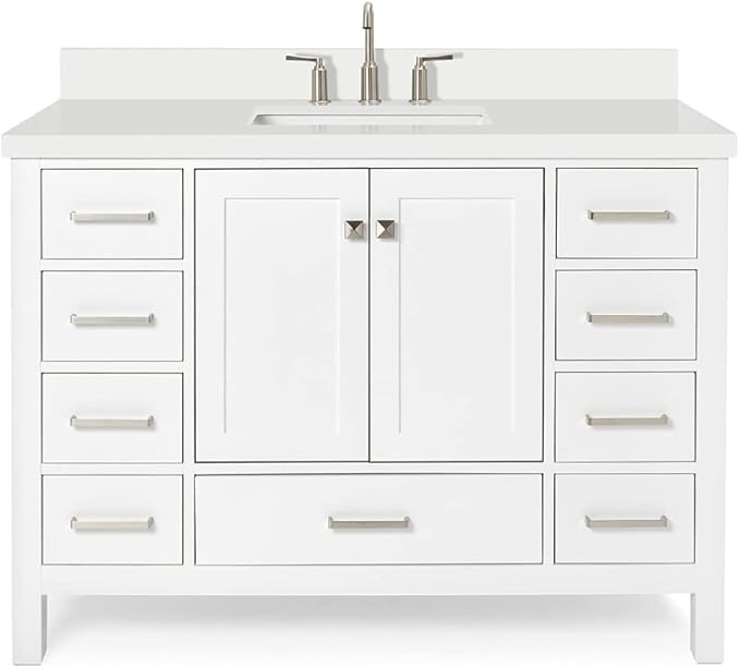 ARIEL 49" White Bathroom Vanity with 1.5" Edge Pure White Quartz Countertop & Backsplash, Center Rectangular Sink, 2 Soft Closing Doors, 9 Full Extension Dovetail Drawers, Brushed Nickel