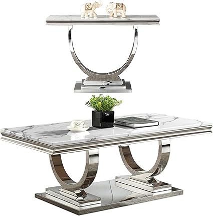 2 Piece Living Room Table Set, Faux Marble Coffee Table and Silver Console Table, Rectangular Luxury White and Silver Coffee Table Set of 2 with Stainless Steel Legs for Apartment Bedroom