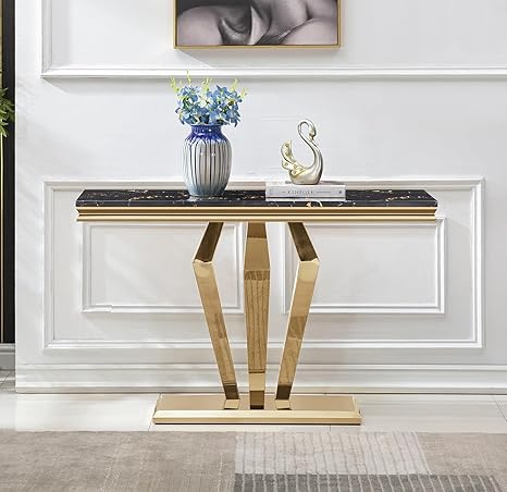 46.85" Black Marble Console Table for Living Room, Faux Marble Sofa Table with Stainless Steel Diamond Base, Mid Century Modern Console Table Entryway Table Hallway Table, Gold Console Table