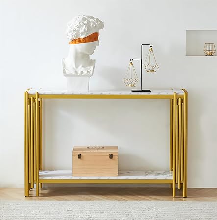 49in Modern Console Table White Faux Marble Sofa Table w/Gold Metal Pipe Frame, 2-Layer Narrow Table Accent Table for Living Room Entayway Table Foyer Table for Hallway (Gold, Console Table)