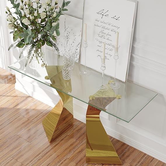 Console Table, 50'' Gold and Glass Entrance Table with Mirrored Gold Stainless Steel Legs, Glam Sofa Table for Entryway, Apartment, Living Room, Fornt Door, Behind Couch, 2024 New