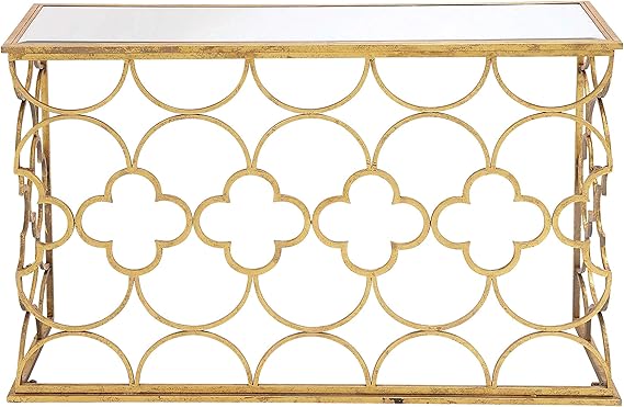 Deco 79 Metal Geometric Quatrefoil Design Console Table with Mirrored Glass Top, 49" x 17" x 31", Gold