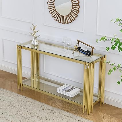 WOKER FURNITURE Modern Console Table, 55" Entryway Table, Entrance Sofa Table, Narrow Console Table with Golden Stainless Steel Frame and Clear Tempered Glass Top, Entry Table for Hallway, Living Room
