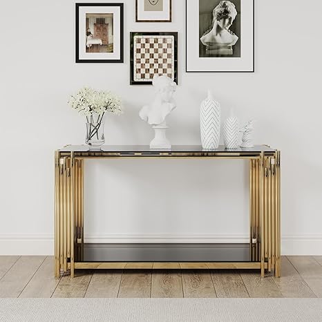 55" Black Console Table for Entryway, 2-Tier Gold Entryway Table Narrow Long Sofa Table with Storage, Glass Entrance Table for Front Door, Hallway Table with Mirrored Golden Stainless Steel Frame