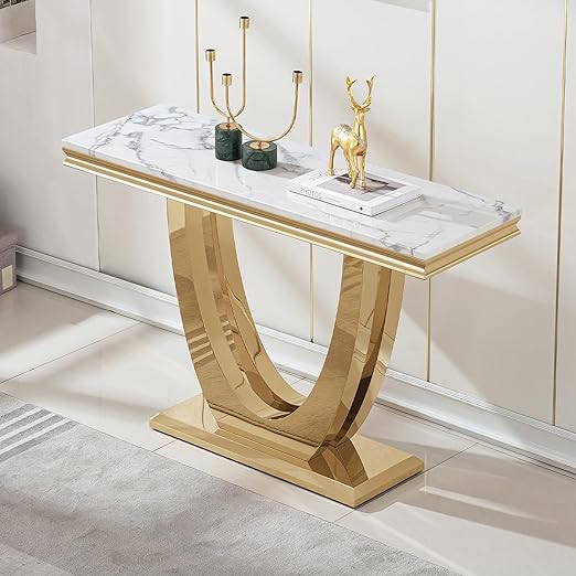 White Marble Console Table Entryway Table, Long Narrow Console Table with Gold U Shape Stainless Steel Base, Sofa Console Table Behind Couch, Mid Century Modern Console Table for Living Room