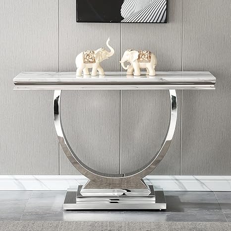 White Marble Console Table with Mirrored Stainless Steel Metal Base, Faux Marble Top Console Table Narrow Console Table, Modern Console Table for Entryway Hallway Living Room, Silver Console Table
