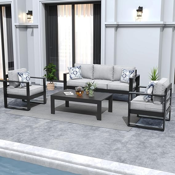 4 Piece Modern Aluminum Patio Furniture Set, Outdoor Patio Sectional Conversation Metal Seating Sets with Olefin Cushion and Coffee Table