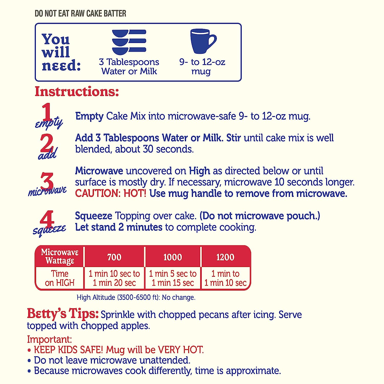 These single serve treats are made in the microwave for an anytime indulgence that’s as easy as it is delicious. Just add water, stir and microwave for 1 minute! Betty's Tips: Serve topped with whipped cream, ice cream, or your favorite candy bar, cut into small pieces.