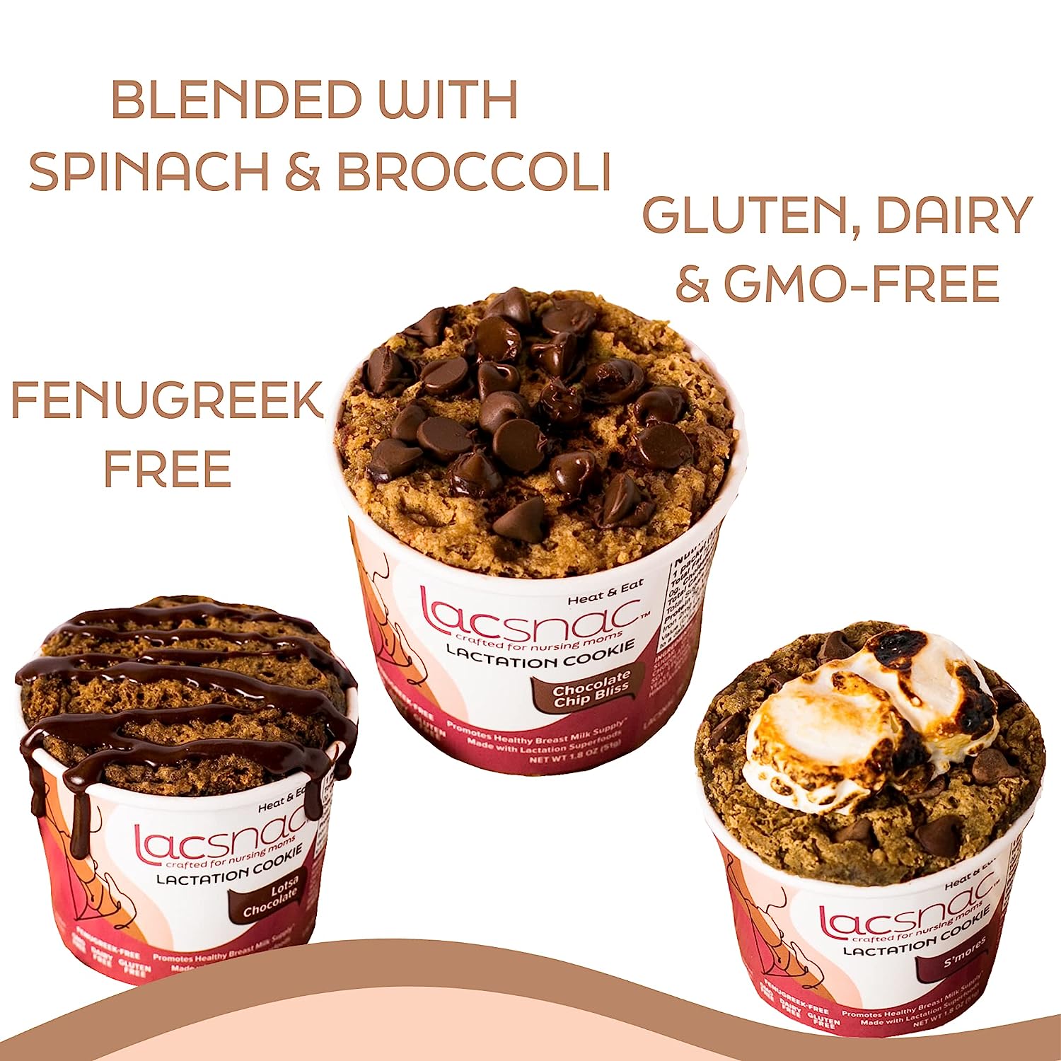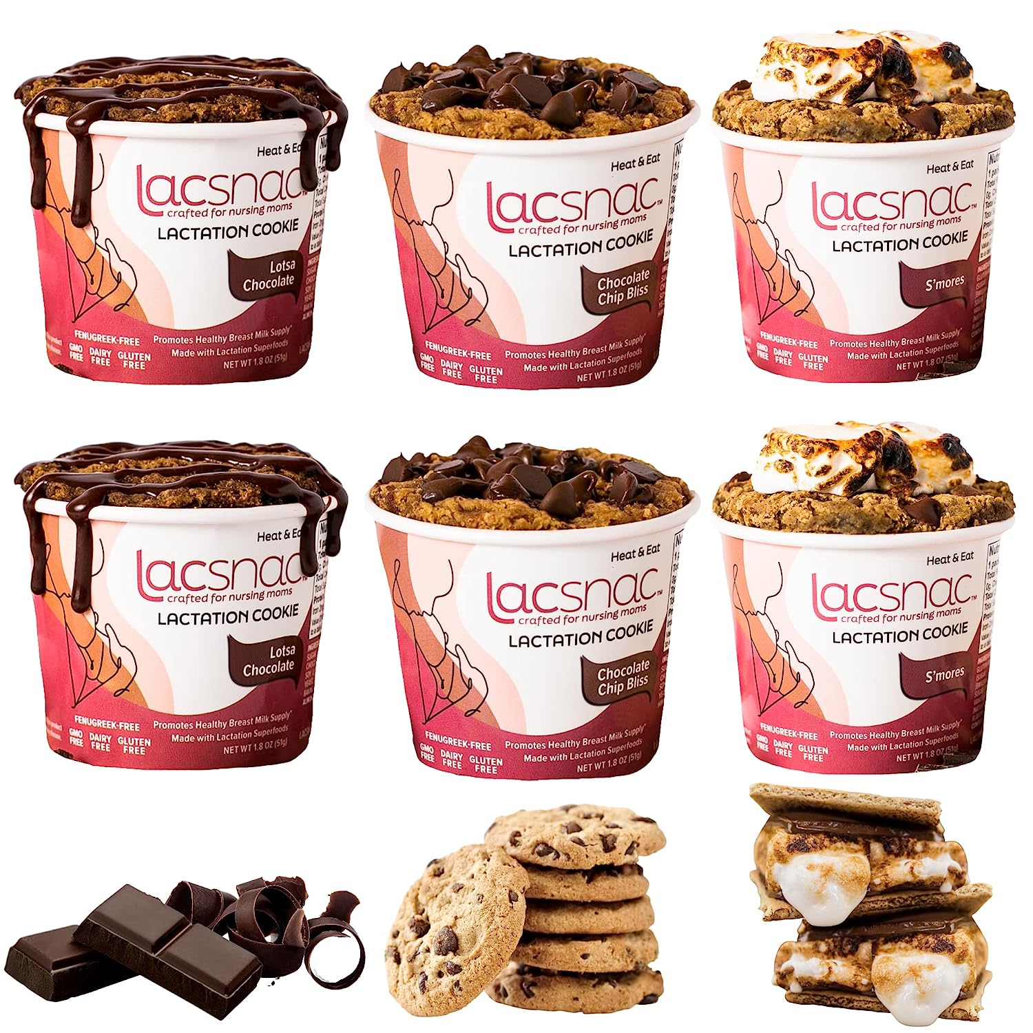 Lacsnac Lactation Cookie Cup Variety Pack - Chocolate Chip Bliss, Lotsa Chocolate, S'mores (1.8 oz, Pack of 6) for Nursing Moms - Made With Flax Seeds, Brewer’s Yeast, Spinach - Promotes Lactation Support & Healthy Breast Milk Supply - GMO-free, Gluten-fr