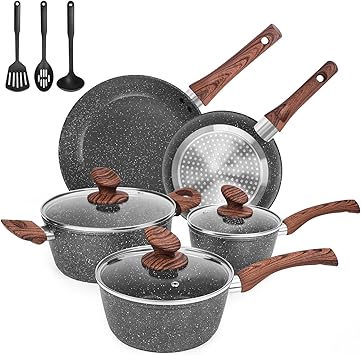 Granite Pots and Pans Set Ultra Nonstick, 11 Piece Die-Cast Cookware Sets with Frying Pan, Sauce Pan, Stockpot, Stay Cool Handle & Kitchen Utensils, Gas/Induction Compatible, 100% PFOA Free