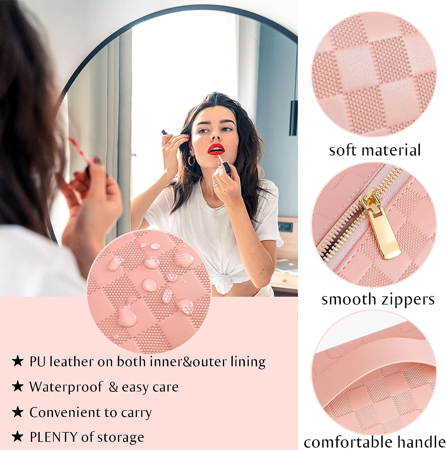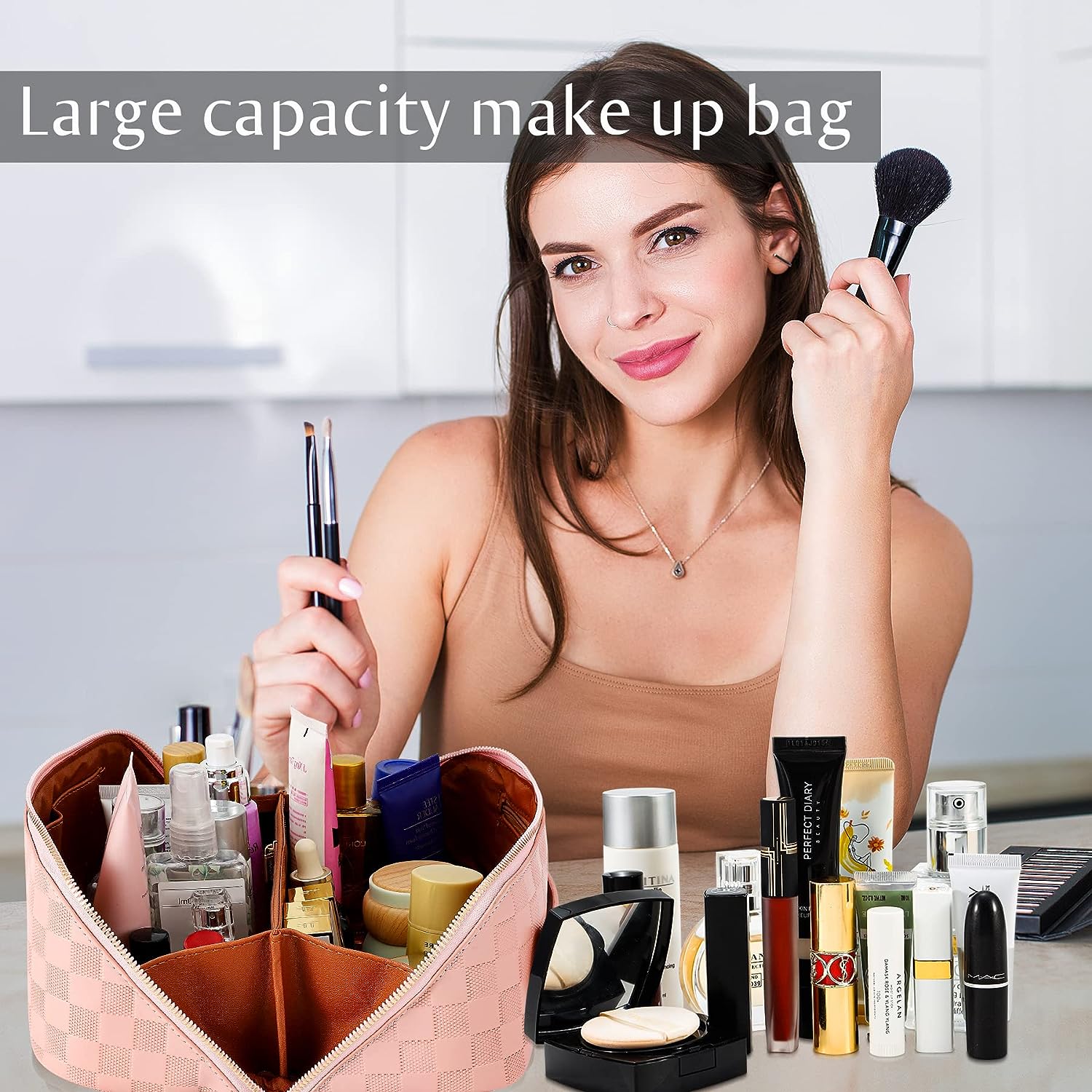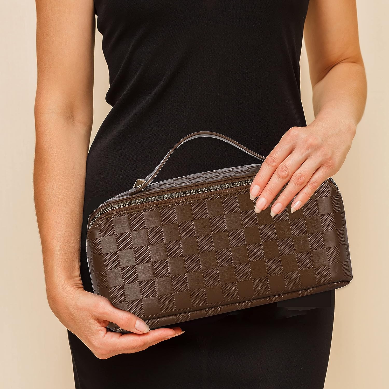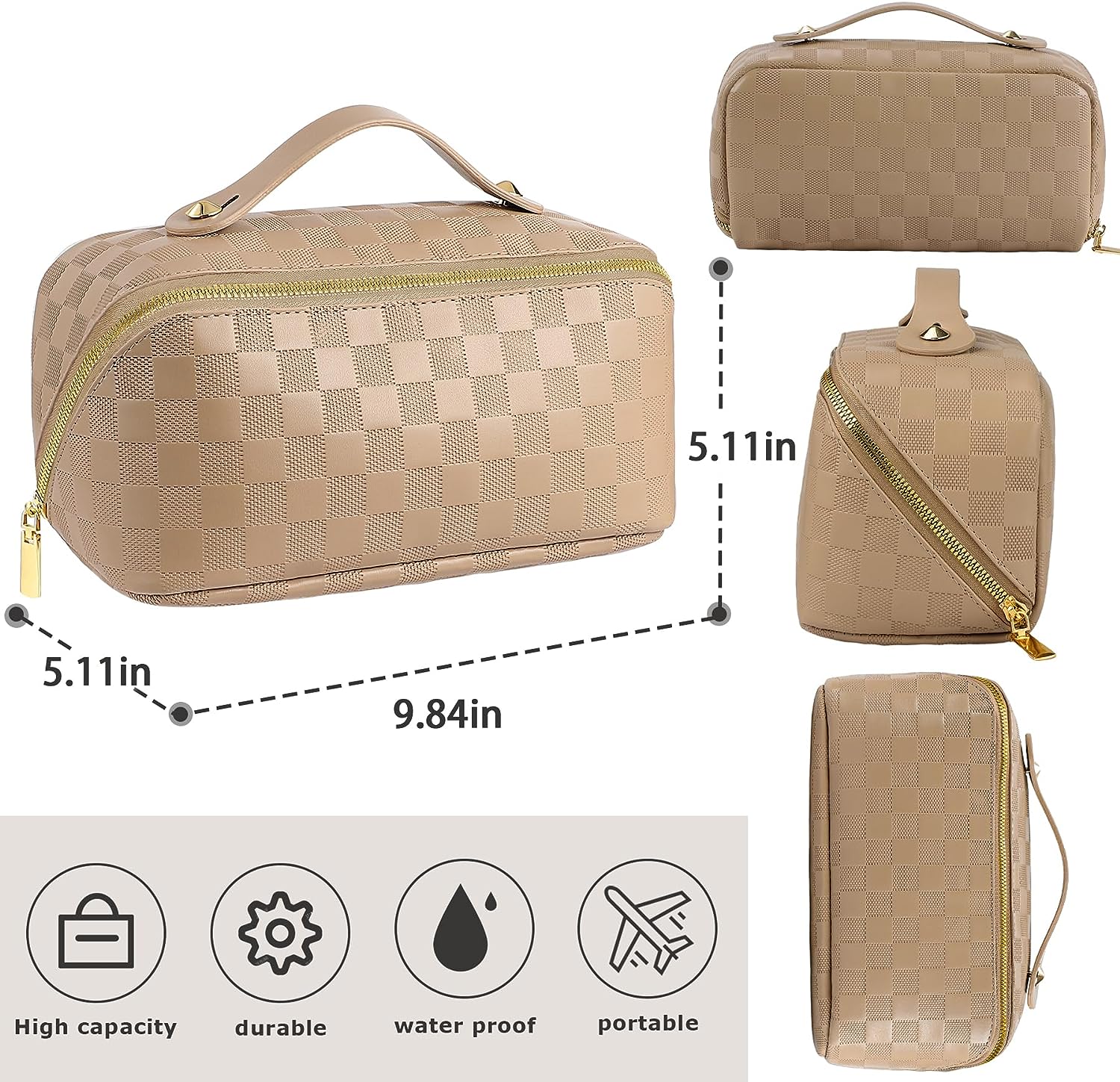 ALEXTINA Large Capacity Travel Cosmetic Bag - Portable Makeup Bags for Women Travel Toiletry Bag Waterproof Leather Checkered Makeup Organizer Bag, Roomy Cosmetic Bag for Women and Girls, Black