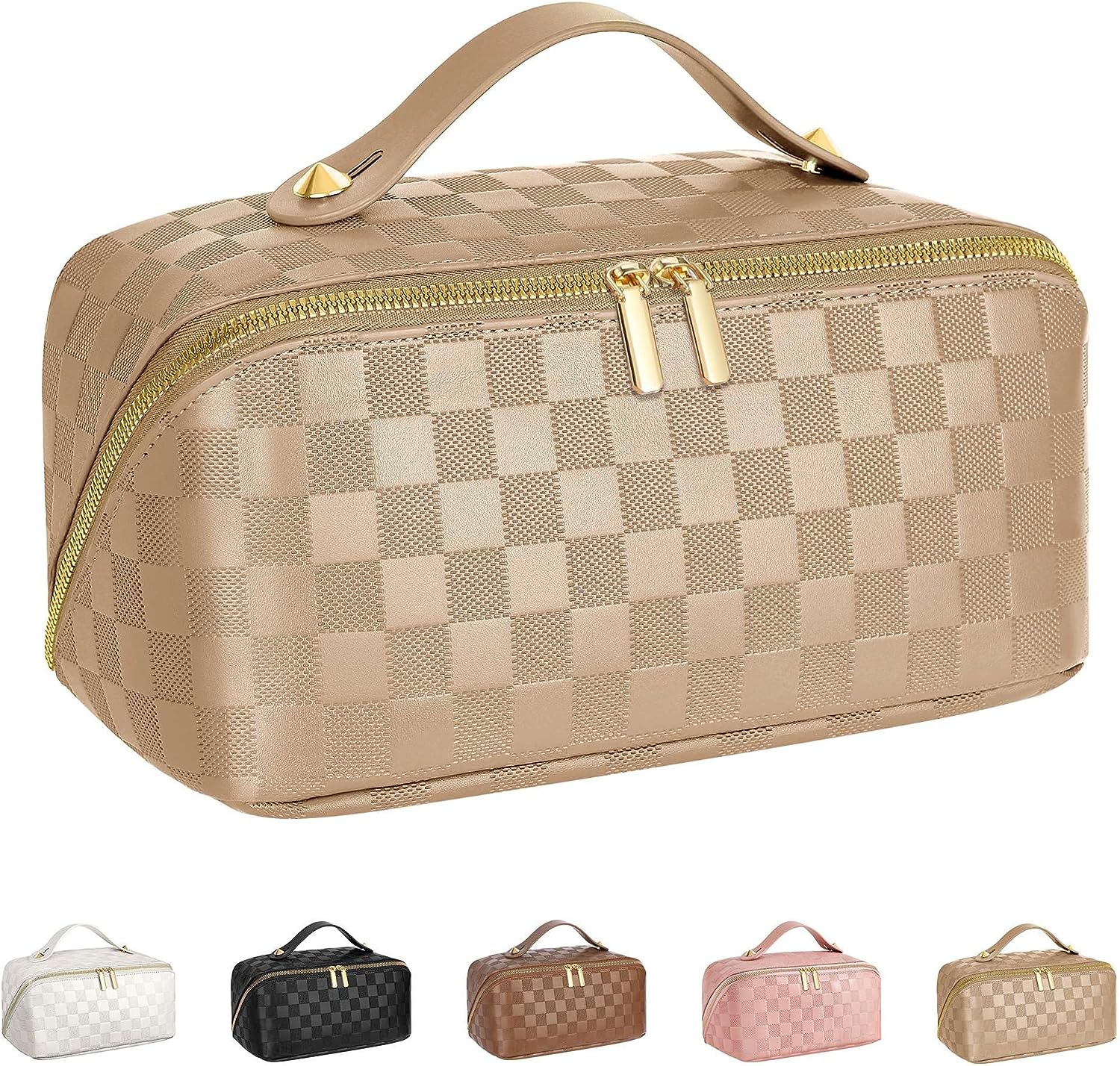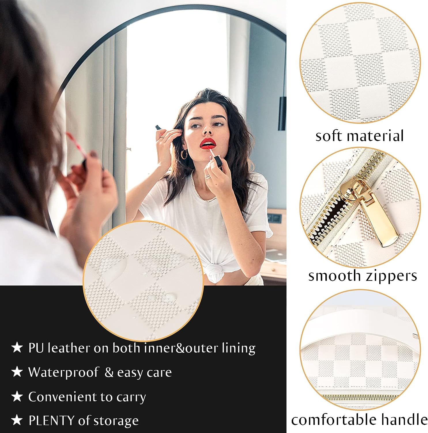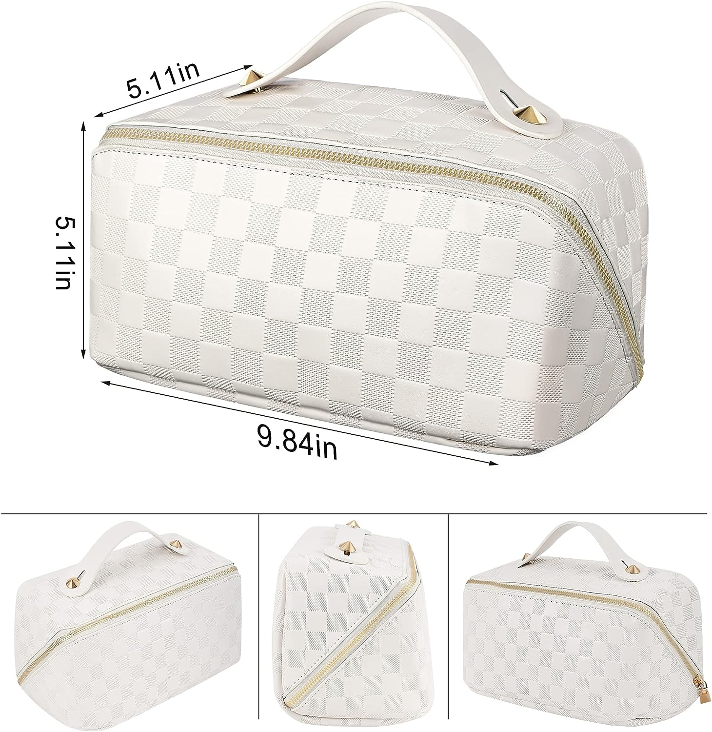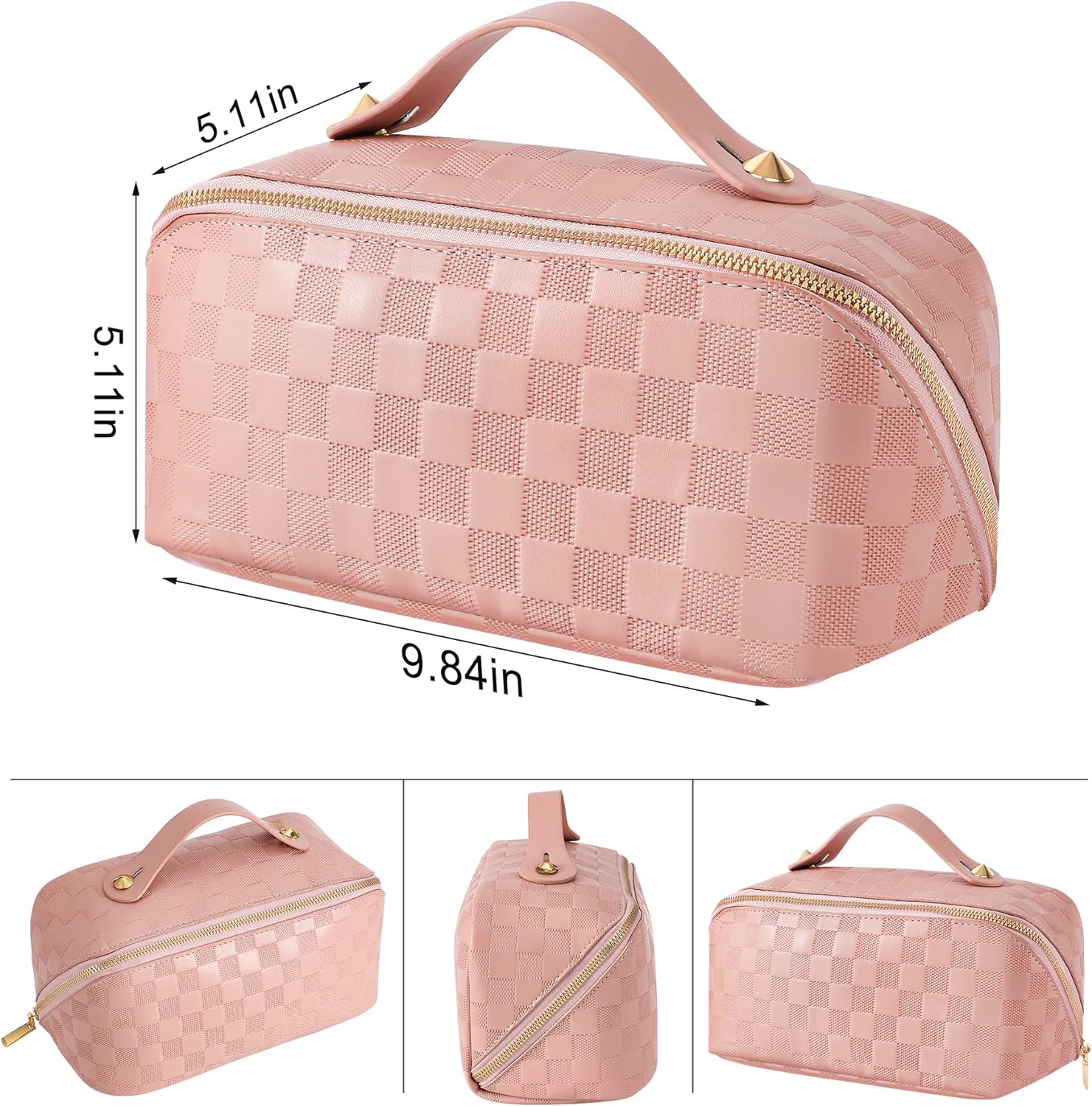 ALEXTINA Large Capacity Travel Cosmetic Bag - Portable Makeup Bags for Women Travel Toiletry Bag Waterproof Leather Checkered Makeup Organizer Bag, Roomy Cosmetic Bag for Women and Girls, Black