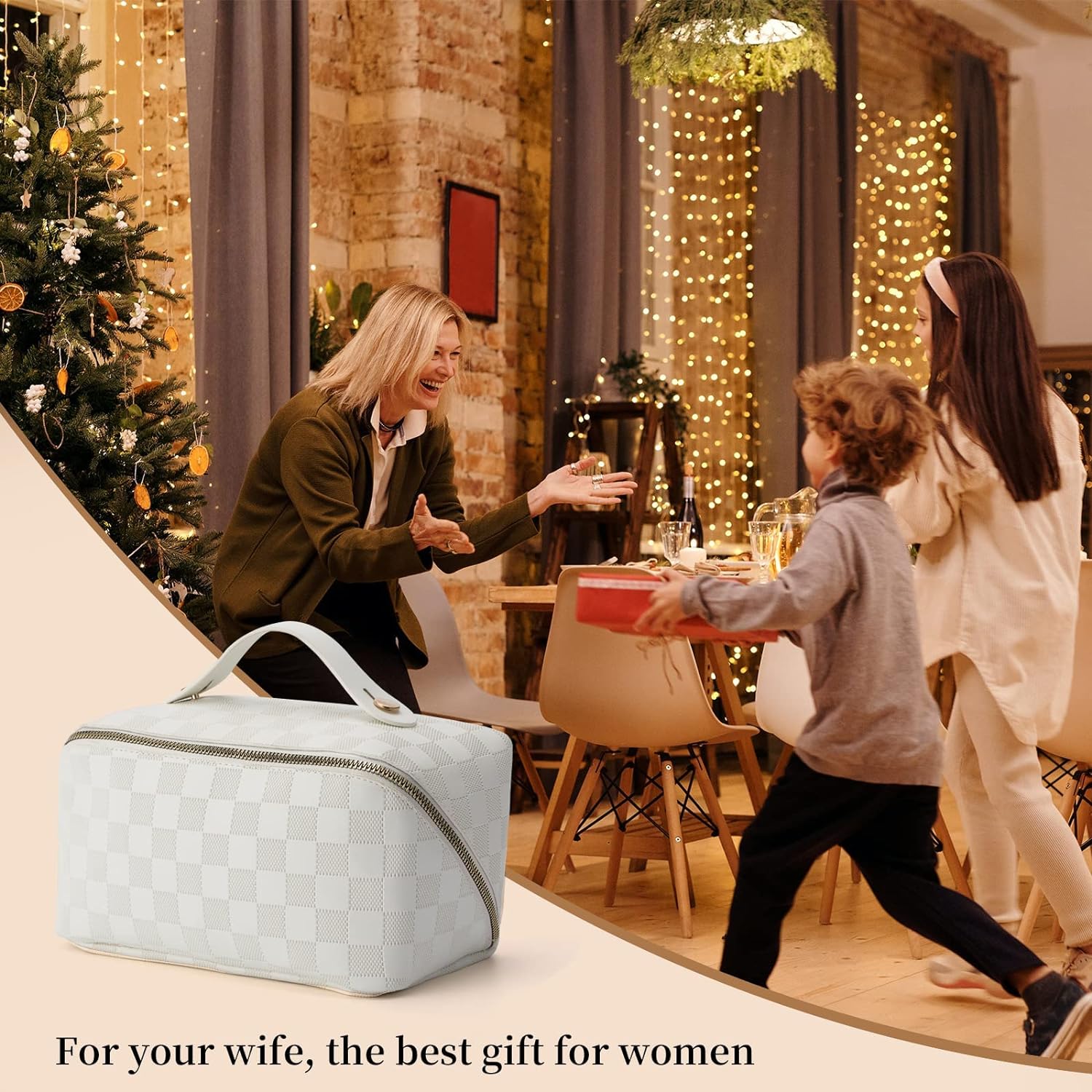 CIREA Brown Large Capacity Travel Cosmetic Bag Plaid Checkered Makeup Bag PU Leather Waterproof Skincare Bag with Handle and Divider (Classic White)